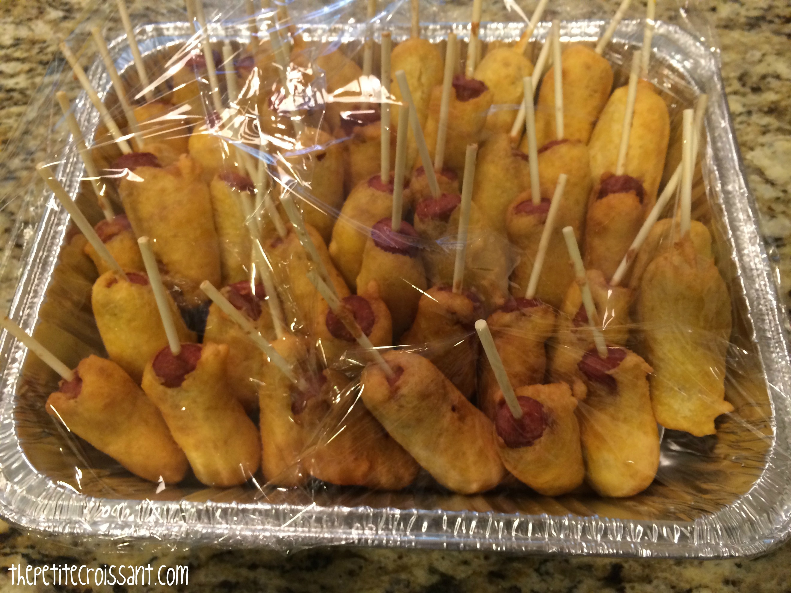 Making classic snack appetizers has become a favorite hobby of mine. They’re generally simple, always a big crowd pleaser, and just look fun. By classic snacks, I mean things like corn dogs, pretzels, popcorn, nachos, mini pizzas, mini mac & cheeses, mini pot pies, etc. So for those of you attending a Super Bowl party this Sunday and who agreed to bring an appetizer, here is the recipe for my new favorite one – the mini corn dog, and links to a few other ideas!
