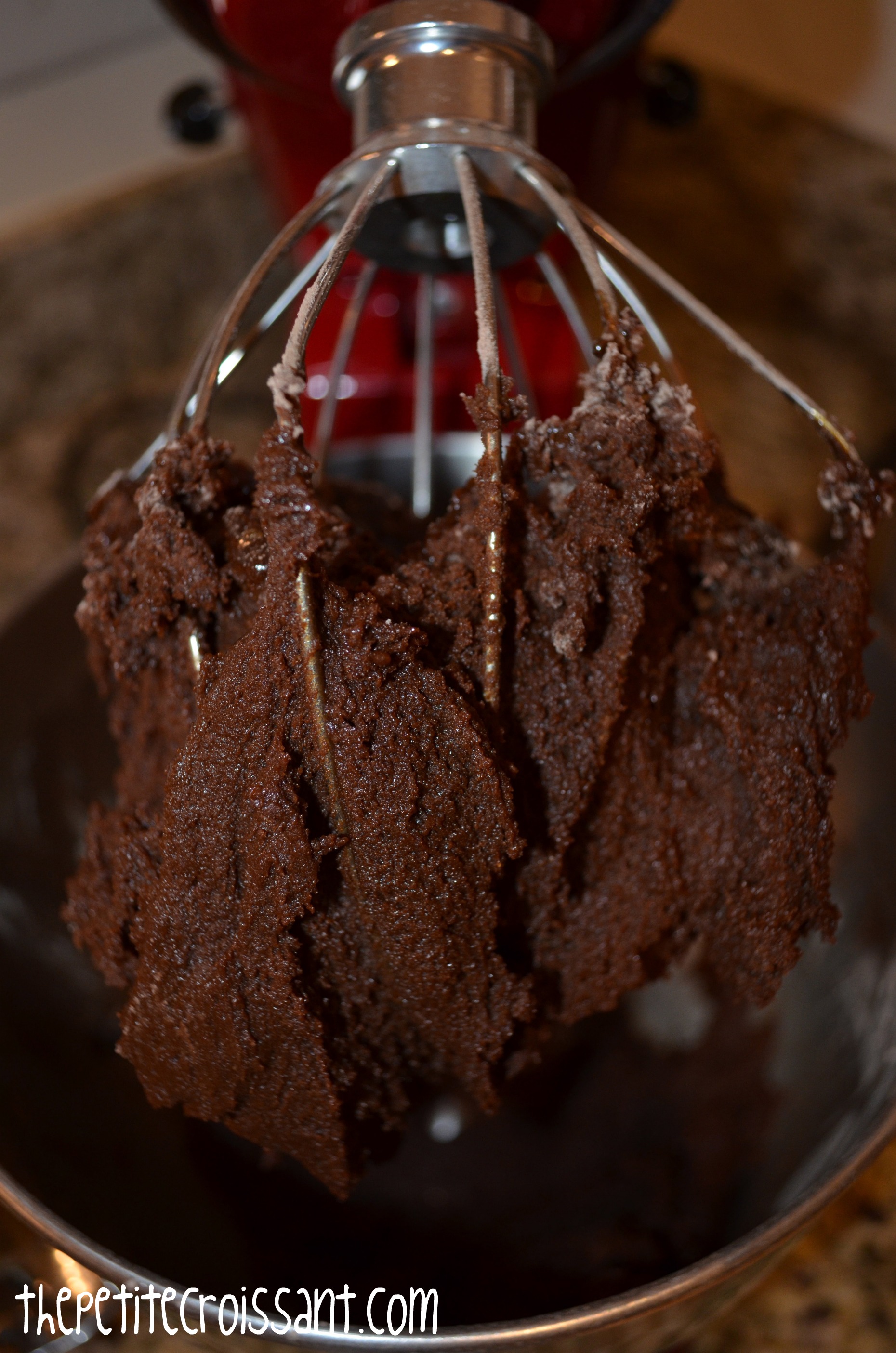 3. In a bowl, whisk flour with cocoa and baking soda. Pour into the electric mixer, but stop just as everything is combined. Place the bowl of your electric mixer in the fridge and chill until the dough is firm, should take 20-30 minutes. While the dough is chilling, place the other half of the white sugar in a bowl.