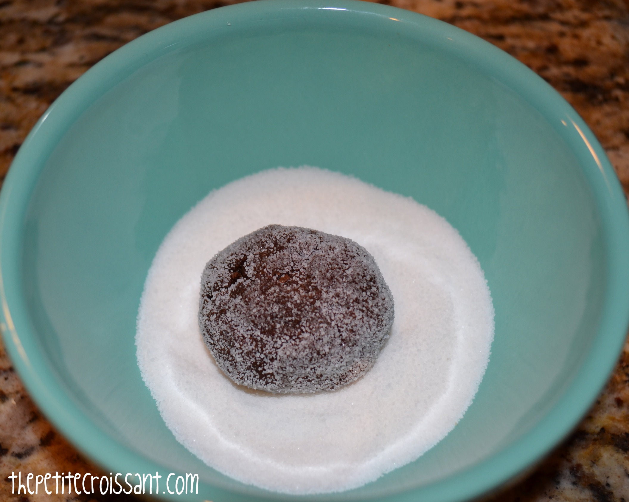 4. Roll dough into balls, about 1/4 cup each. Roll the ball in the sugar and place on the pan. Once you’ve done this for all of the dough, use your hands to flatten each ball, about 3/4 inch thick.
