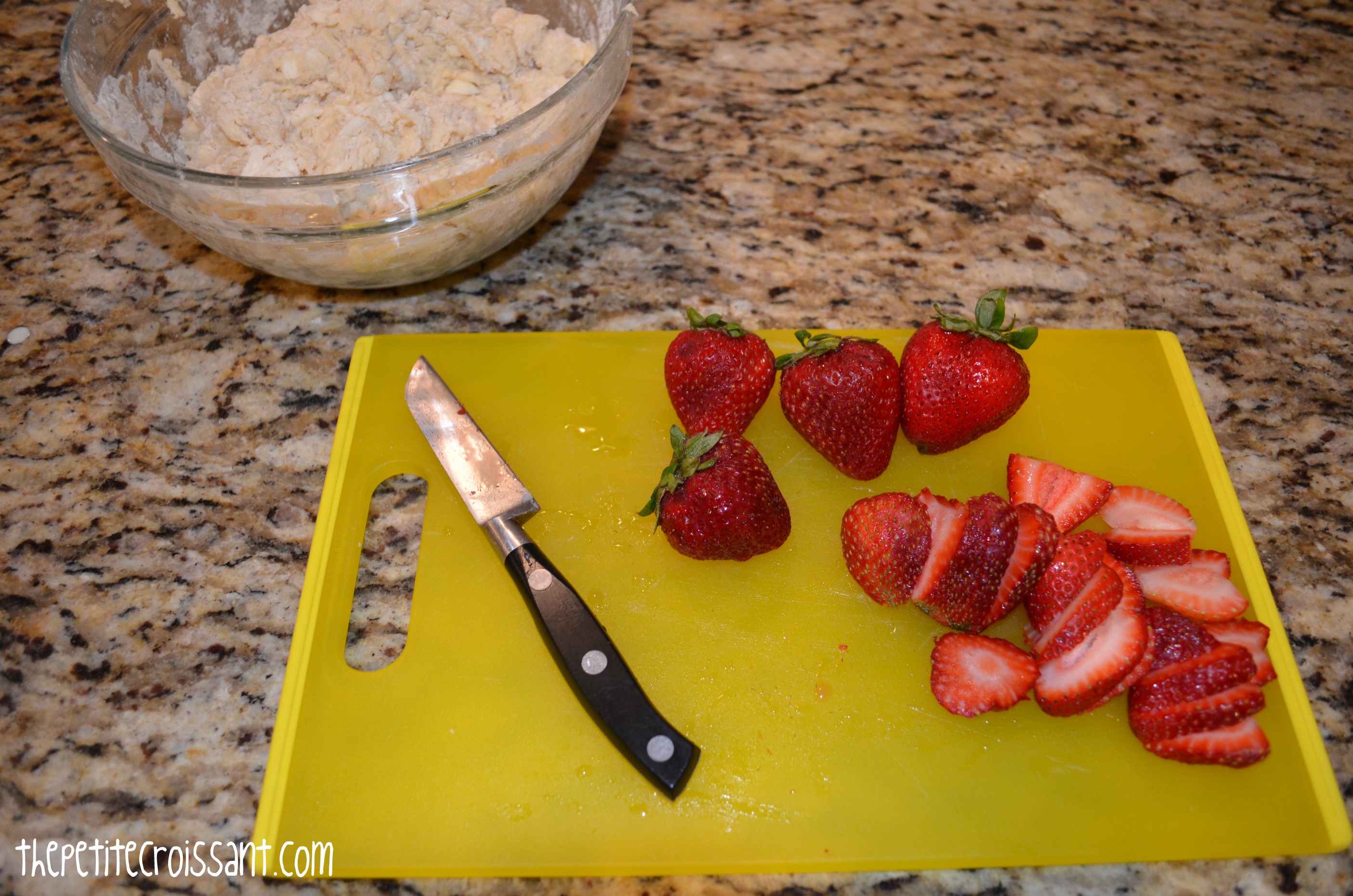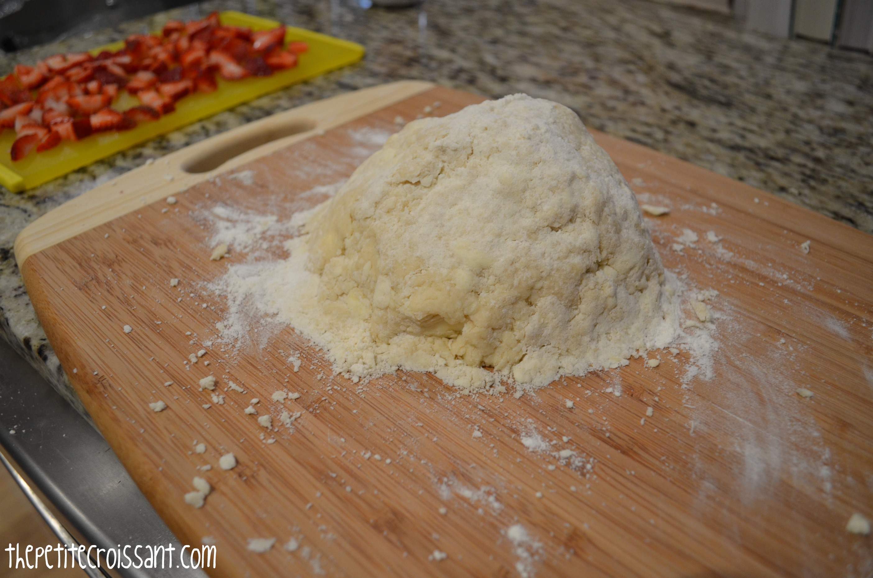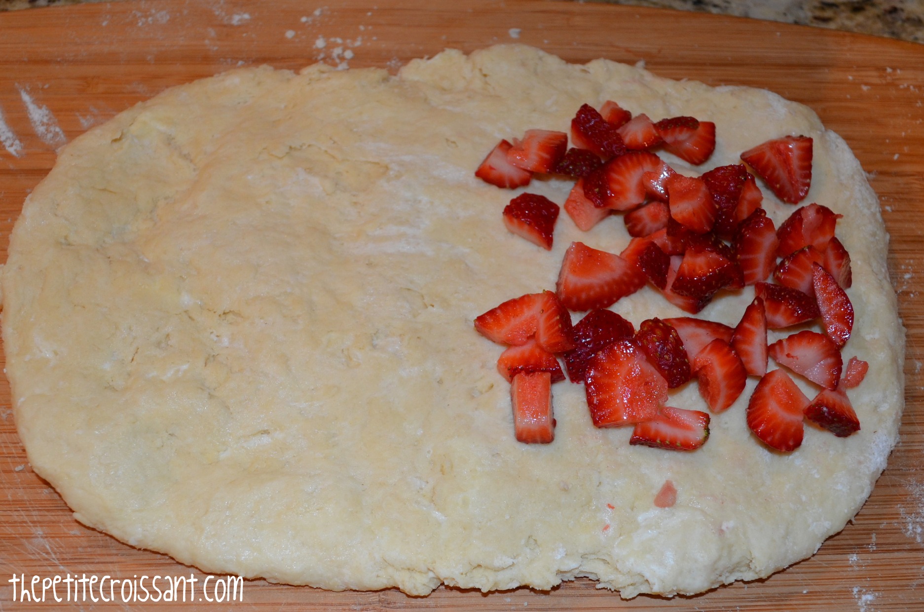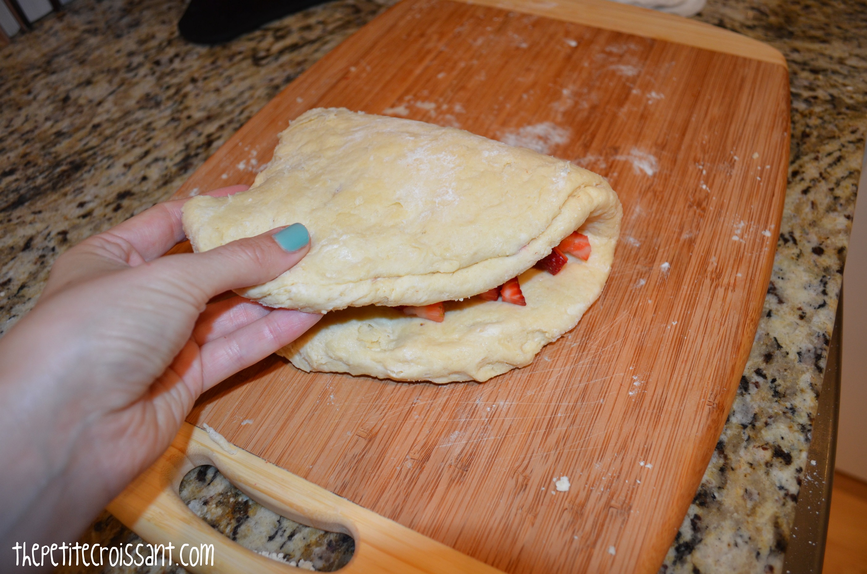 3. Once the dough is almost all incorporated, set the dough onto a floured surface (counter or cutting board should work). You may need to use your hands to mix in the loose flour. Then, use your palms to spread the dough into a wide rectangle. Place half of the strawberries onto half of the dough. Fold the dough in half, and flatten it into a rectangle again. Try to be careful with the dough so that it doesn’t rip. Once the dough is in a rectangle again, put the remaining strawberries on half of the dough and fold it over again. Fold the dough one to two times more, being careful with the strawberries. Shape the dough into a circle, about one inch thick. Note: the dough ripped a couple times for me and I just ripped pieces off of areas with a lot of dough and placed these pieces on the ripped parts.
