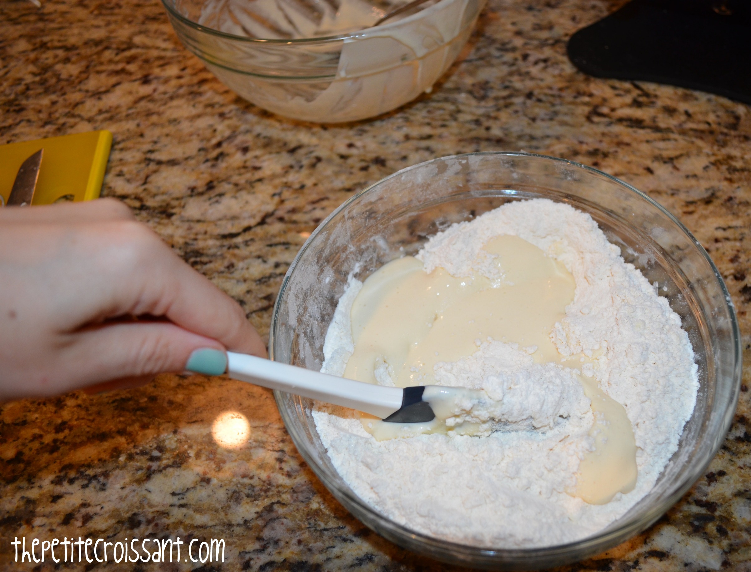 2. Using a whisk, mix the sour cream, egg, and vanilla. Make a hole in the middle of the dry ingredients and pour the wet ones in. Mix carefully, trying to fold the dough and not stir it.