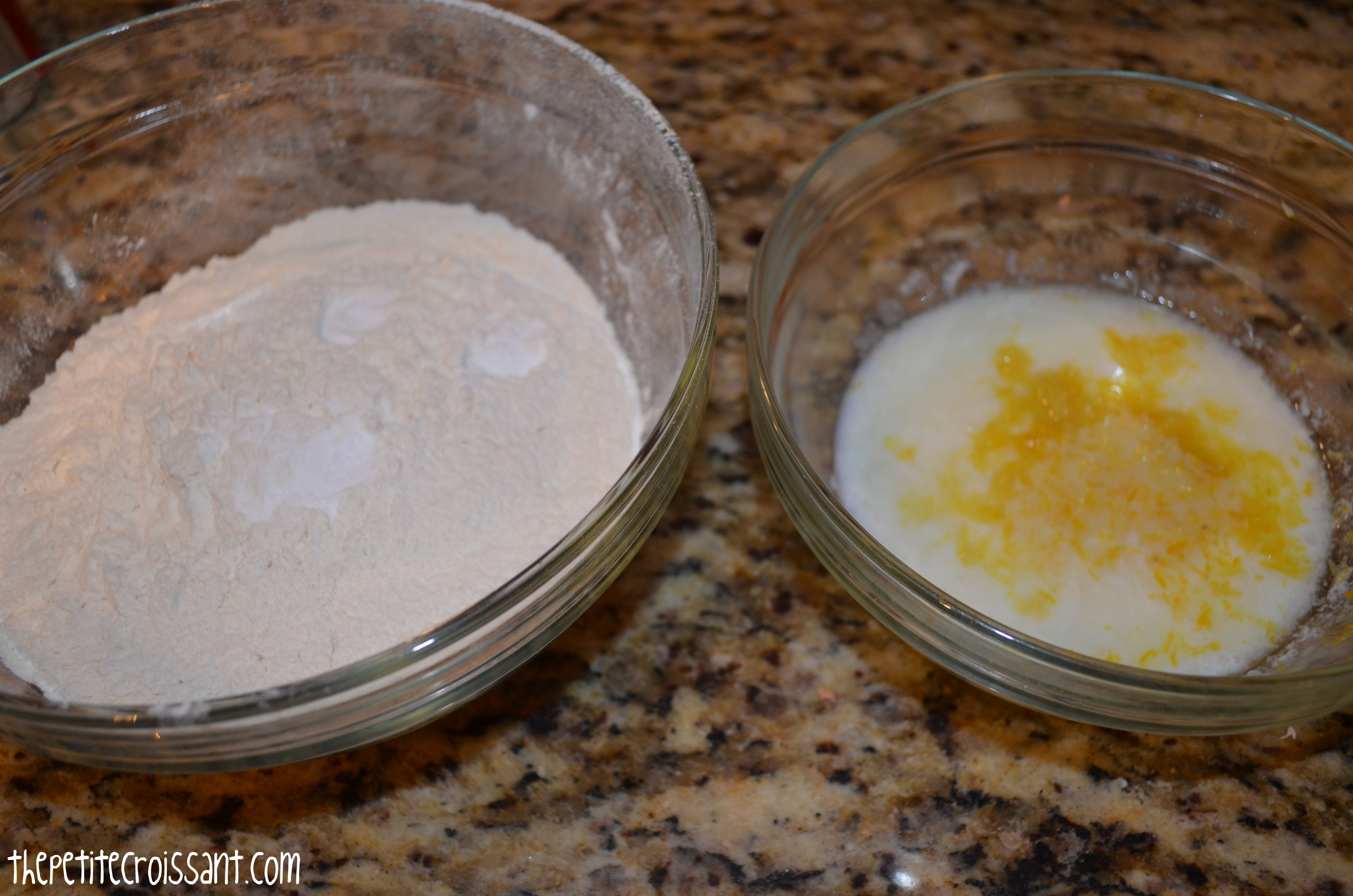 2. Mix flour and baking soda in a small bowl. In a separate bowl, mix milk, lemon zest, and lemon juice.