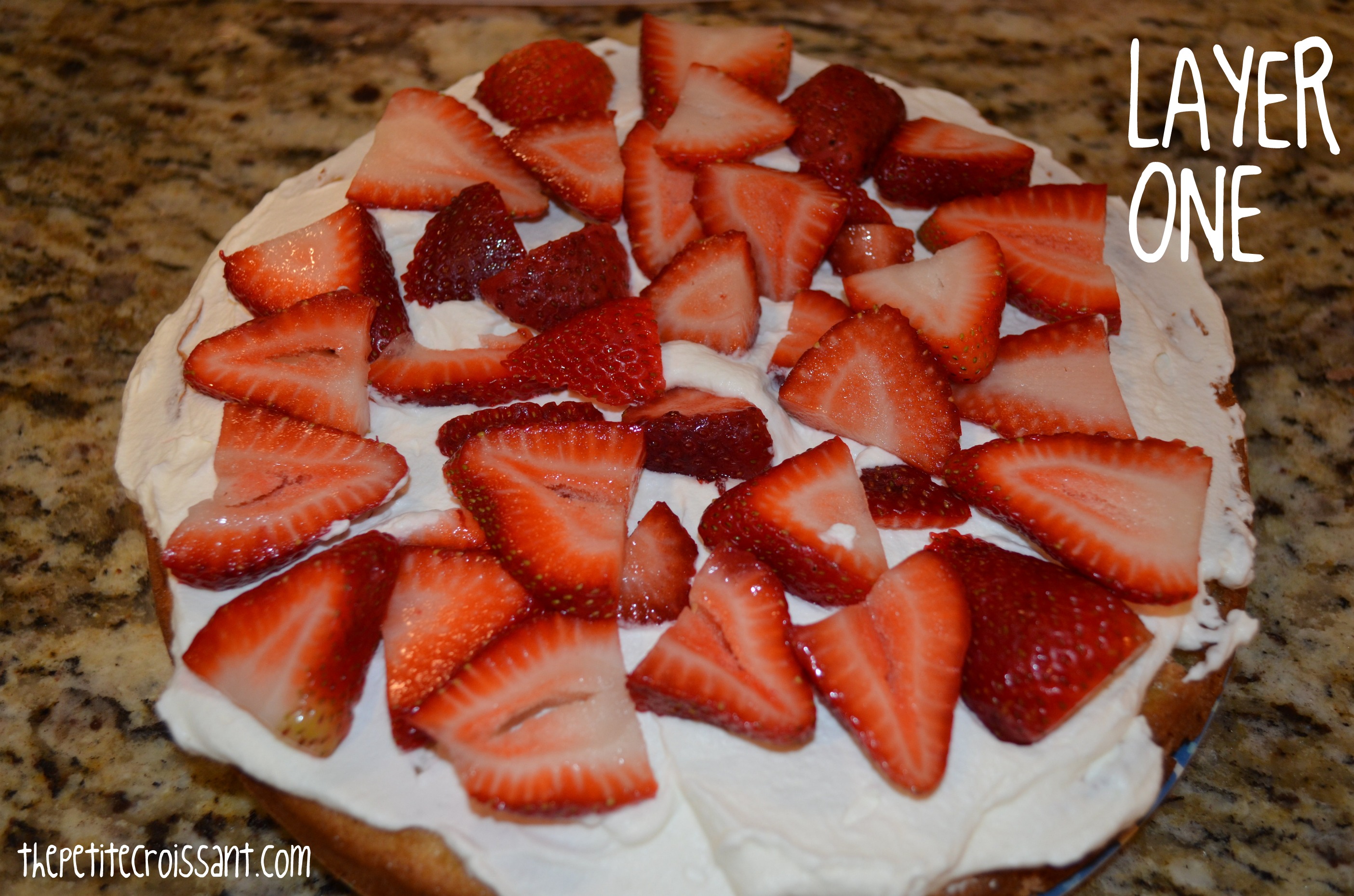 6. Place cake on plate to serve. If you’re just doing the rectangle, go ahead and frost the entire cake. Then decorate the top with fruit. If you’re doing two rounds, place one cake on plate and frost this cake. Place a layer of strawberries on top. Then do another layer of frosting before putting the second cake on top. Finish with another layer of frosting (you can just do it on top, or cover the entire thing). Then finish with fruit on top to decorate.