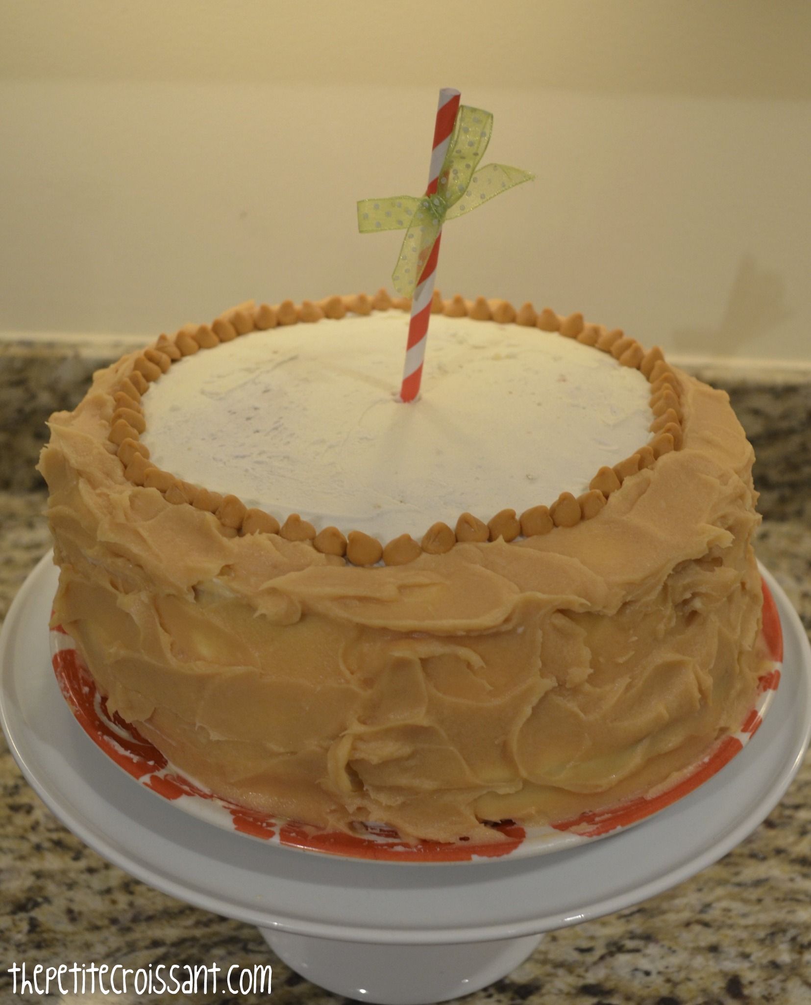 For the second cake, I just used a straw with a ribbon tied around it. This cake had two kinds of frosting, so I used them to create an inner circle on the top, and then outlined it with mini butterscotch chips. You can see the recipe here, but you could also use this technique with a different cake recipe.
