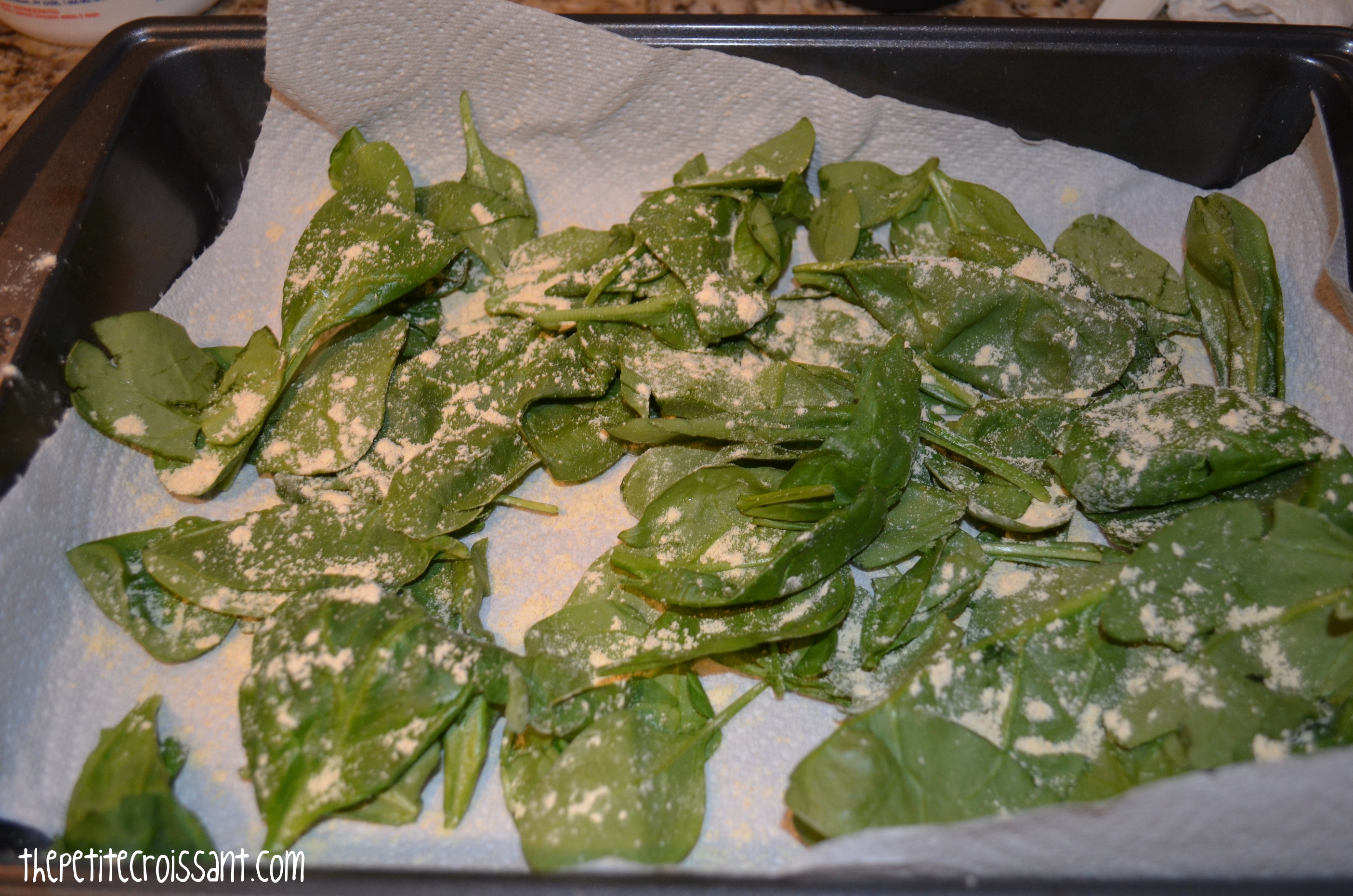 4. Mix the gram flour, teaspoon of salt, baking soda, and chili powder. Once the spinach is dry, spread the leaves on a pan and sprinkle the gram flour on each side.