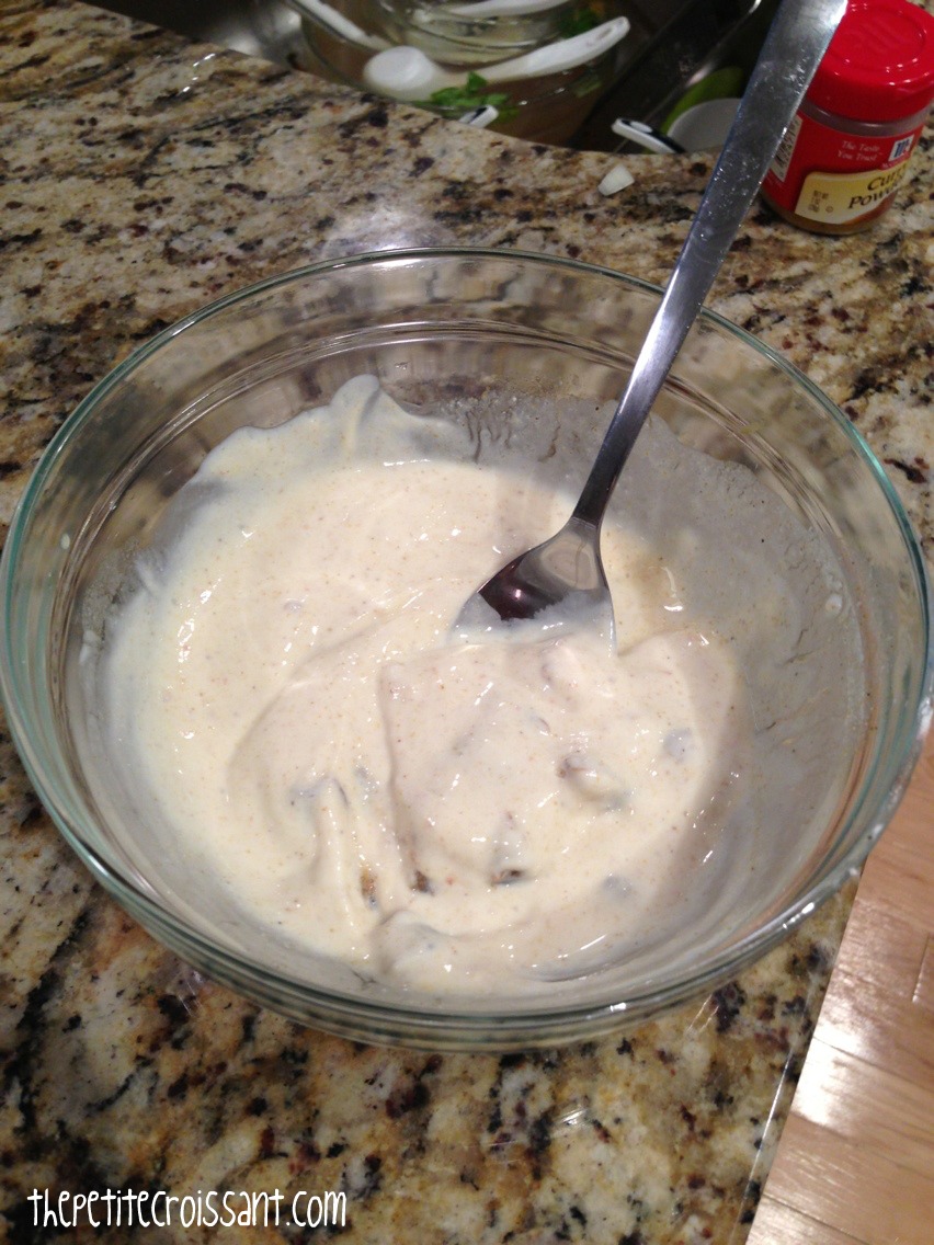 1. First create the yogurt sauce by mixing the yogurt, chopped dates, curry powder, coriander, cumin, lemon juice and water. Once it is mixed, set aside. The longer you let this sit, the better!