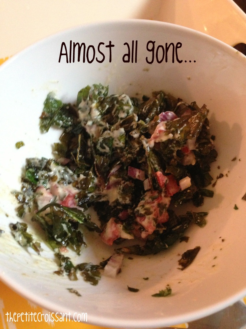 6. Place the leaves in two bowls, and put a spoonful of the yogurt sauce on top. Finish with some chopped tomato, onion and cilantro on top. Enjoy! Pictured below with the chicken tikka masala that will be featured on the blog next week.
