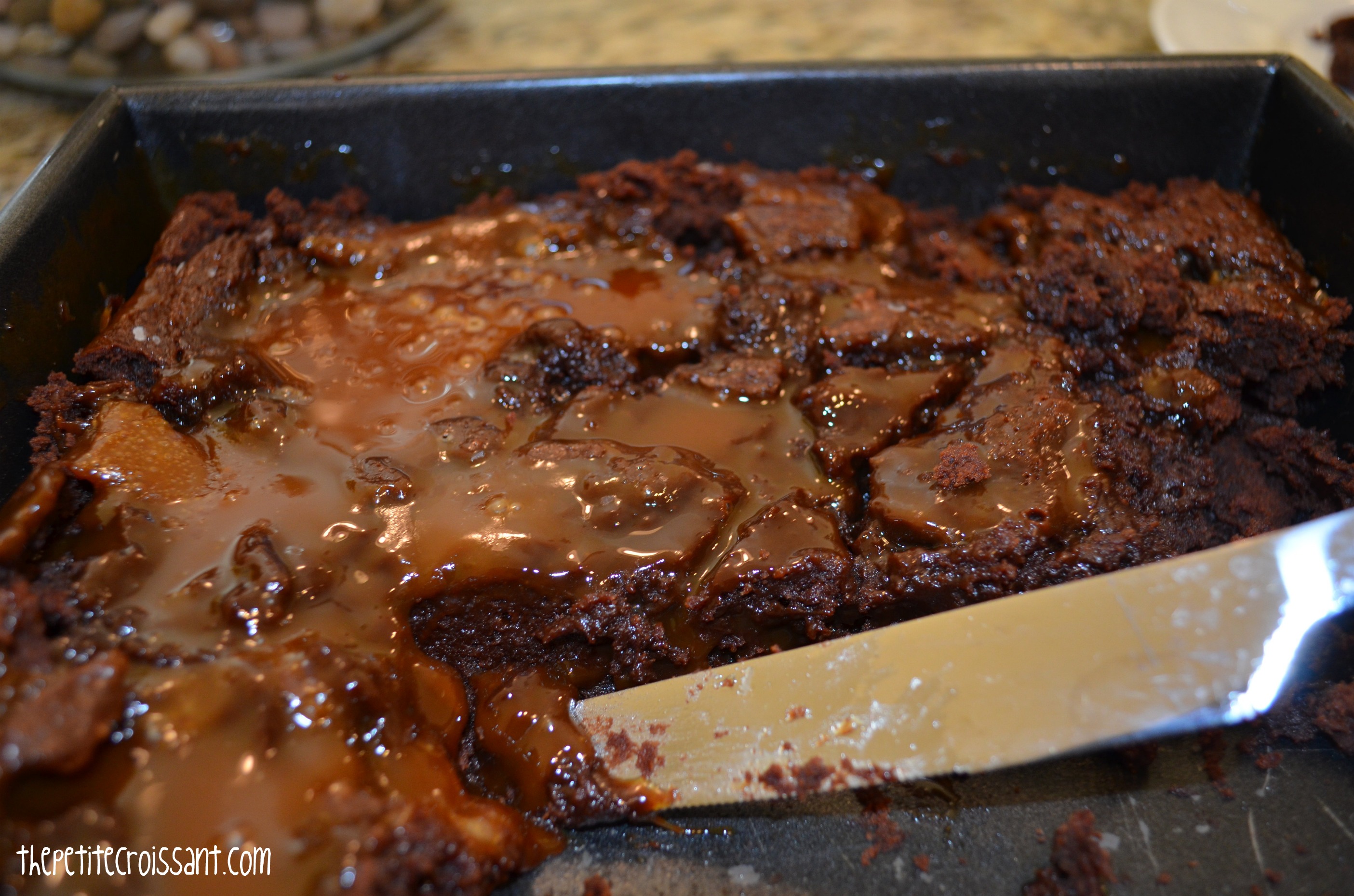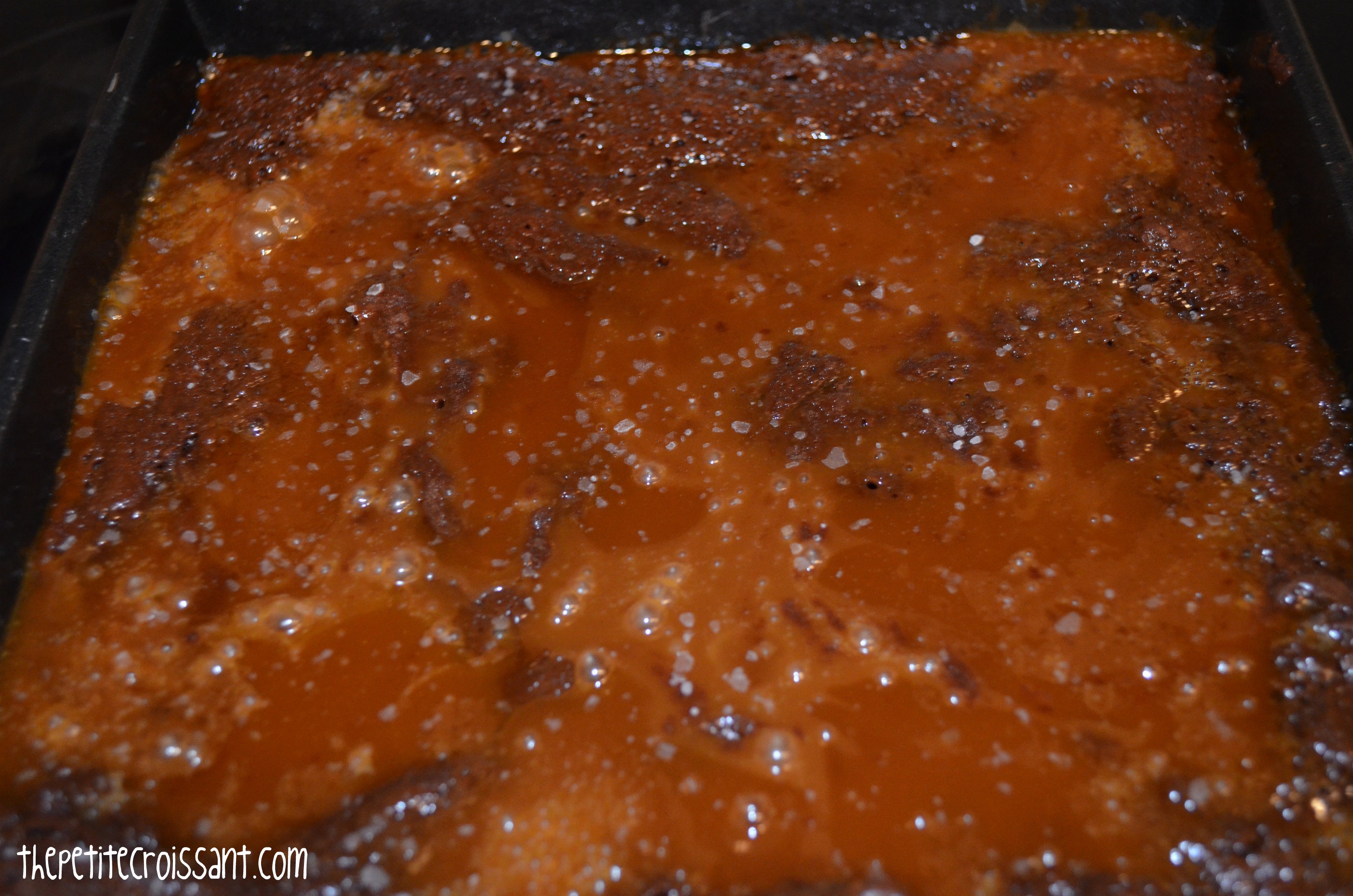 5. Grease a 9 x 9 x 3 inch pan. You may want to line it with wax paper to help the removal/cutting process. I didn’t do this, but will be trying it next time. Pour the batter into the pan. Then pour the caramel on top. Try to smooth the caramel so that it is covering the entire top.