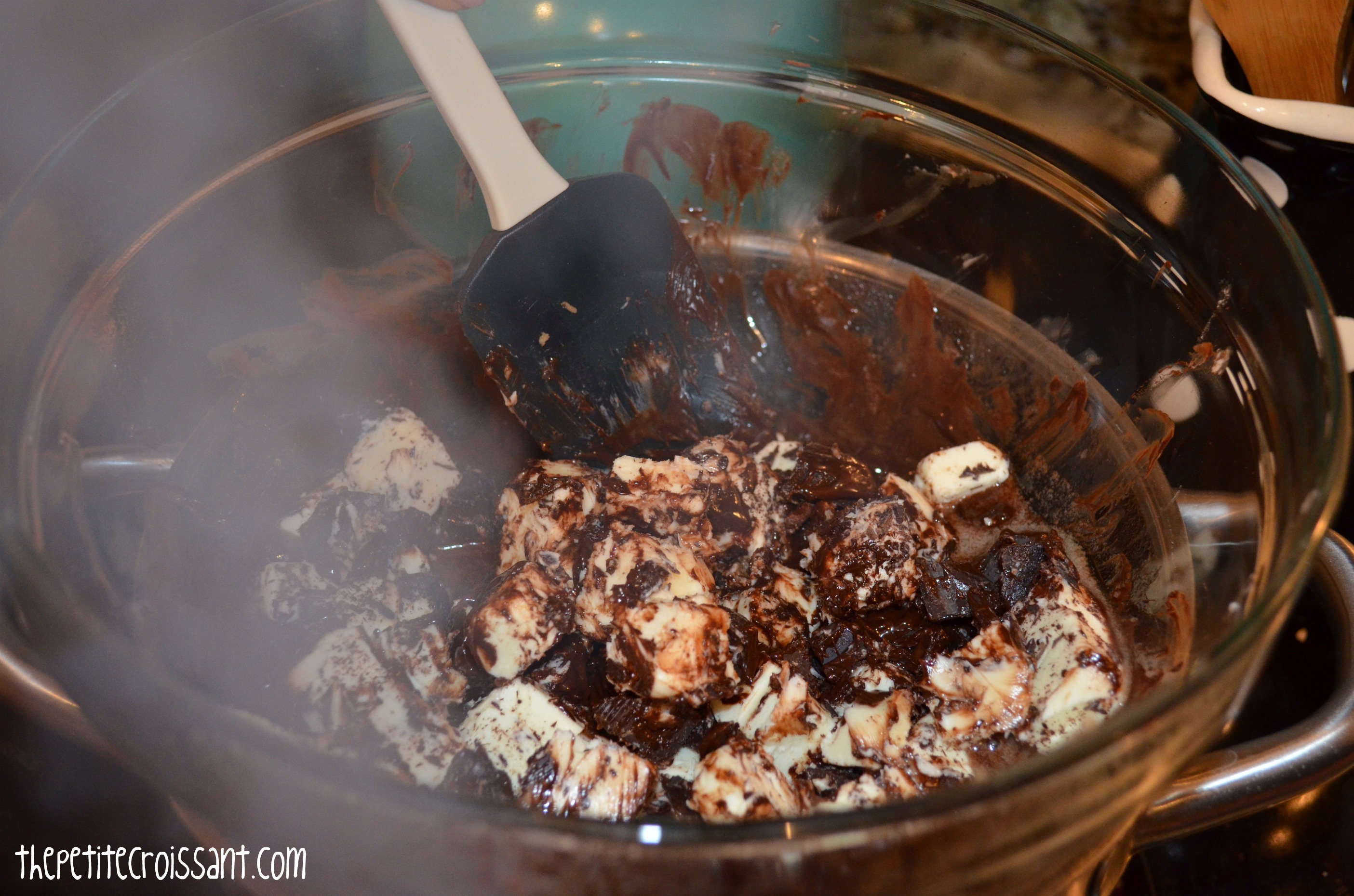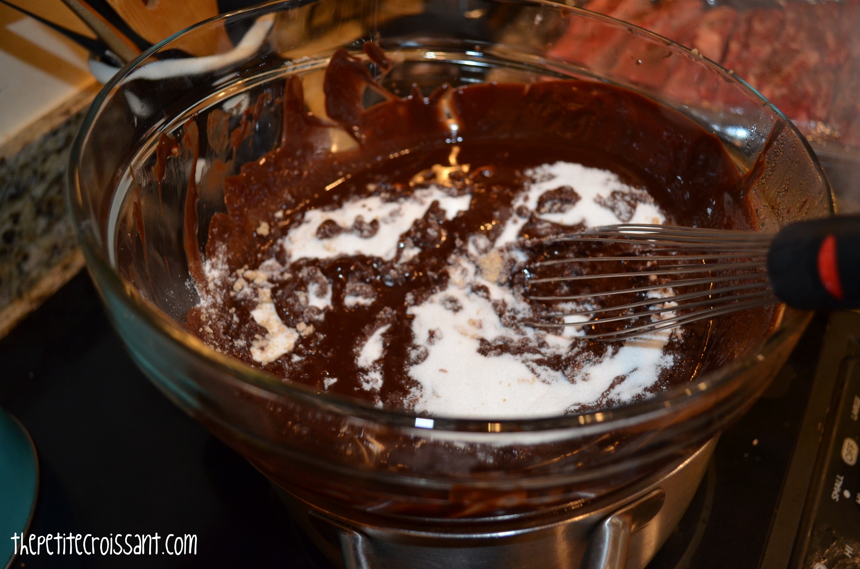 2. In a double broiler if you have it, or heat proof bowl over a pot of boiling water if you don’t, mix the butter and chocolate. Stir until both have melted completely. Turn off the heat, but with the bowl still over the pot of water, add the white and brown sugars and whisk until combined. Remove from stove and let the bowl come to room temperature.