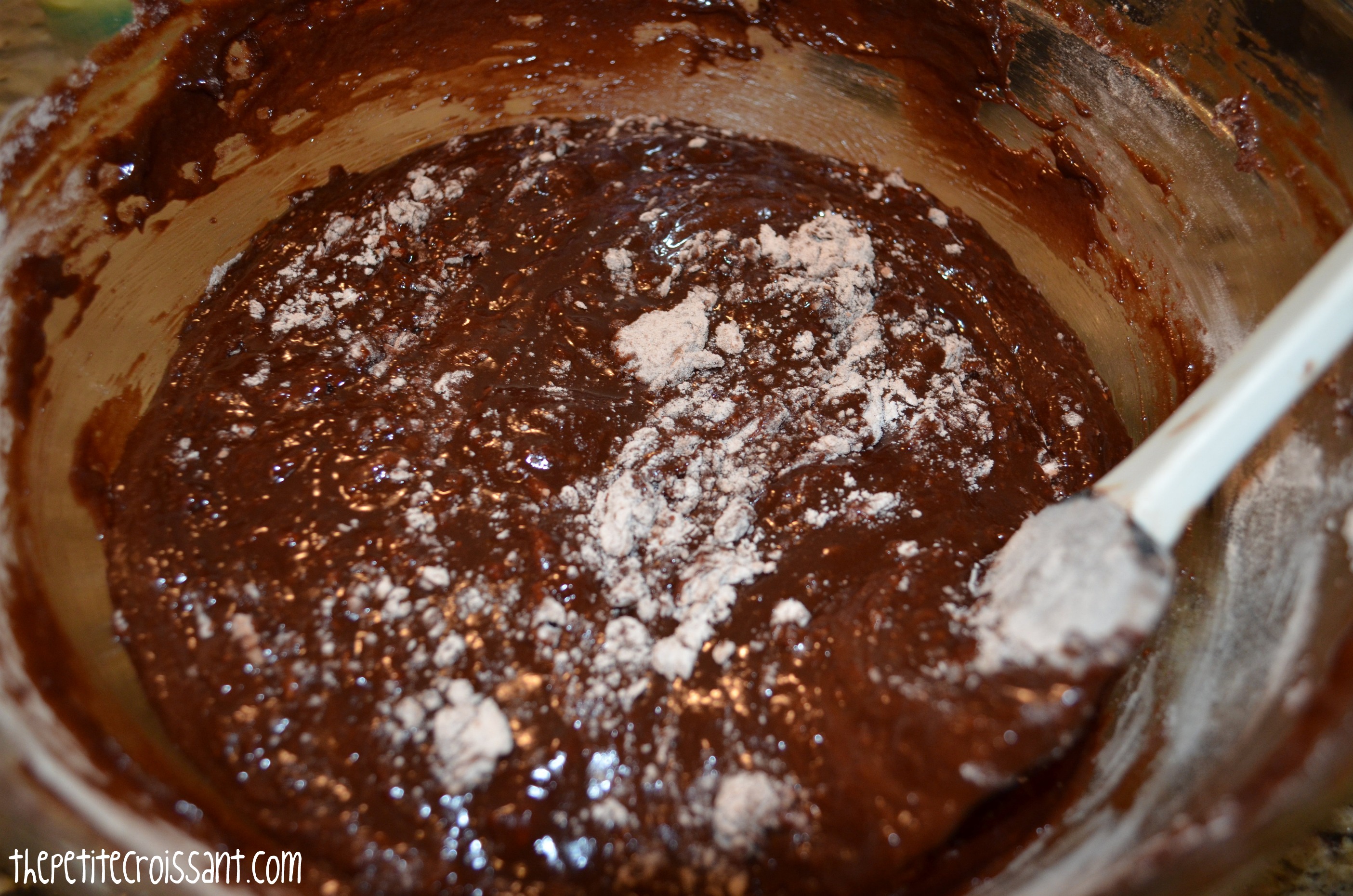 4. Fold the flour/cocoa mixture into the other mixture, and mix until everything is just barely incorporated. You want to try not to overbeat this batter.