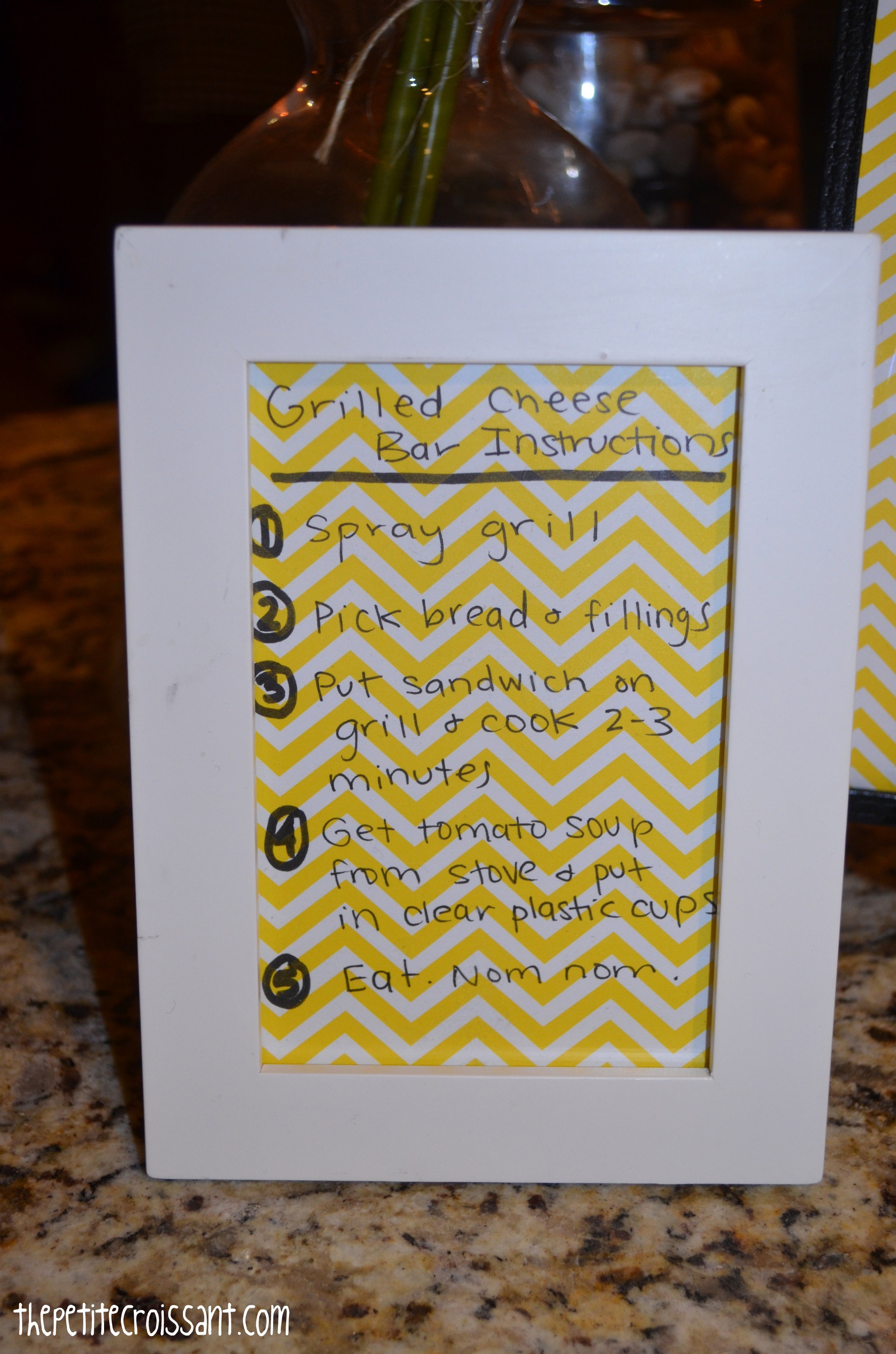 In my opinion, the all-American meal is a grilled cheese with a cup of tomato soup. Not sure why, it just is. It’s also the best comfort food! For the birthday party I threw back in June, I was trying to do really fresh, all-American food because the guest of honor had just returned from a month long stint in the Middle East. And so of course I had to serve grilled cheeses. The hard part is that these are obviously best when hot. So I set up all of the ingredients, and then let people make their own on a little George Foreman Grill. I also had a pot of tomato soup warming on the stove, that people could ladle into small cups to eat with the sandwiches.