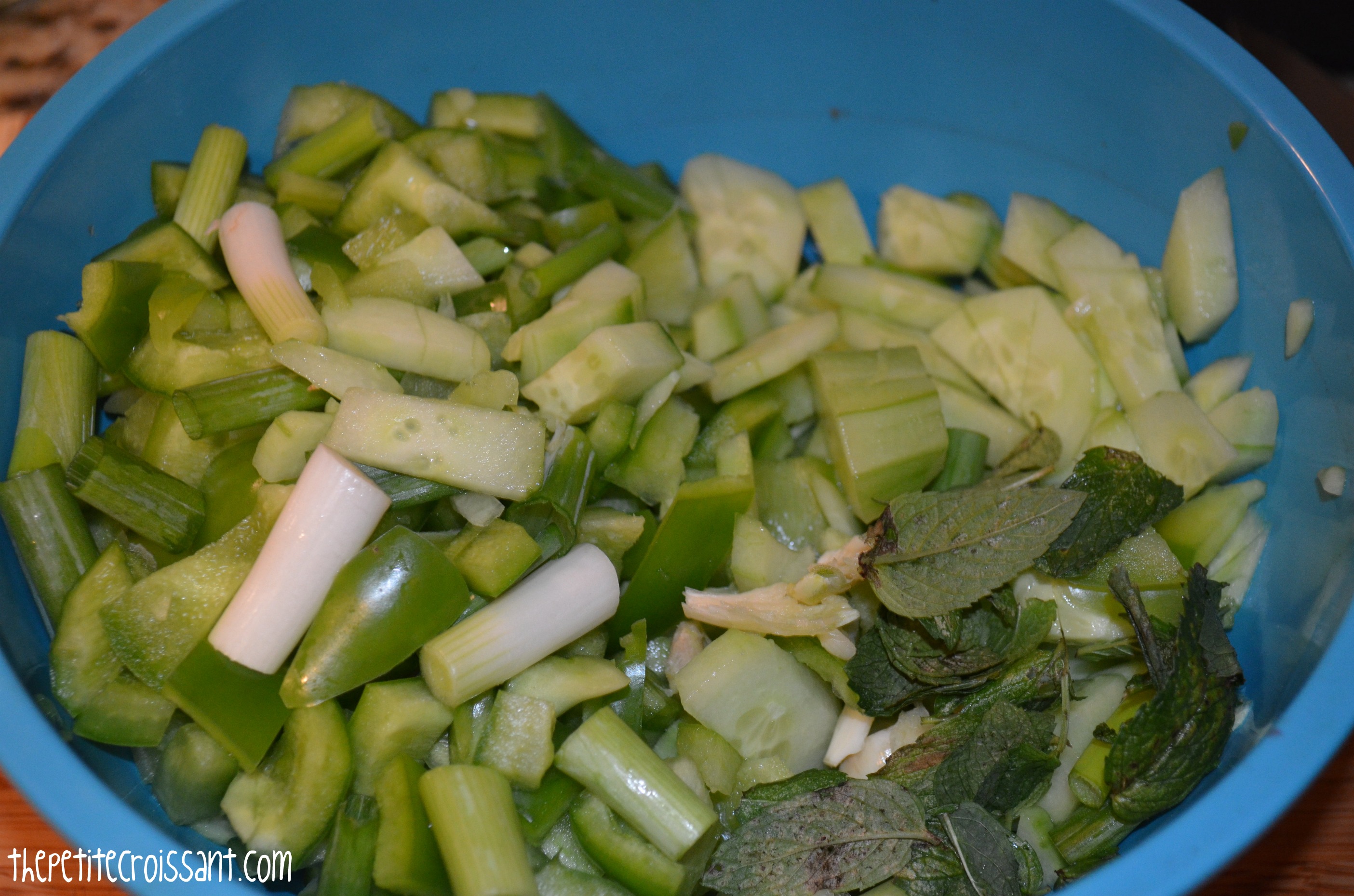 1. Set aside a few pieces of chopped cucumber, pepper, onion, and mint leaves. These are just for garnish. Place the rest of the cucumber, pepper, onion, and mint in a Cuisinart. Add the cayenne pepper, mint, and garlic and pulse until it is a liquid.