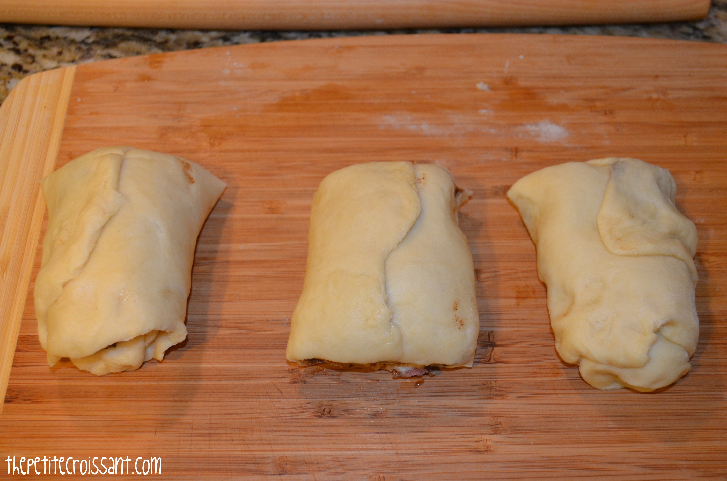 7. Prepare a 9 x 9 square baking dish with cooking spray or butter. Place the rolls inside, with one of the open sides on top. Let the rolls rise for another hour (again you can put them in a warm spot if you need to expedite this phase).
