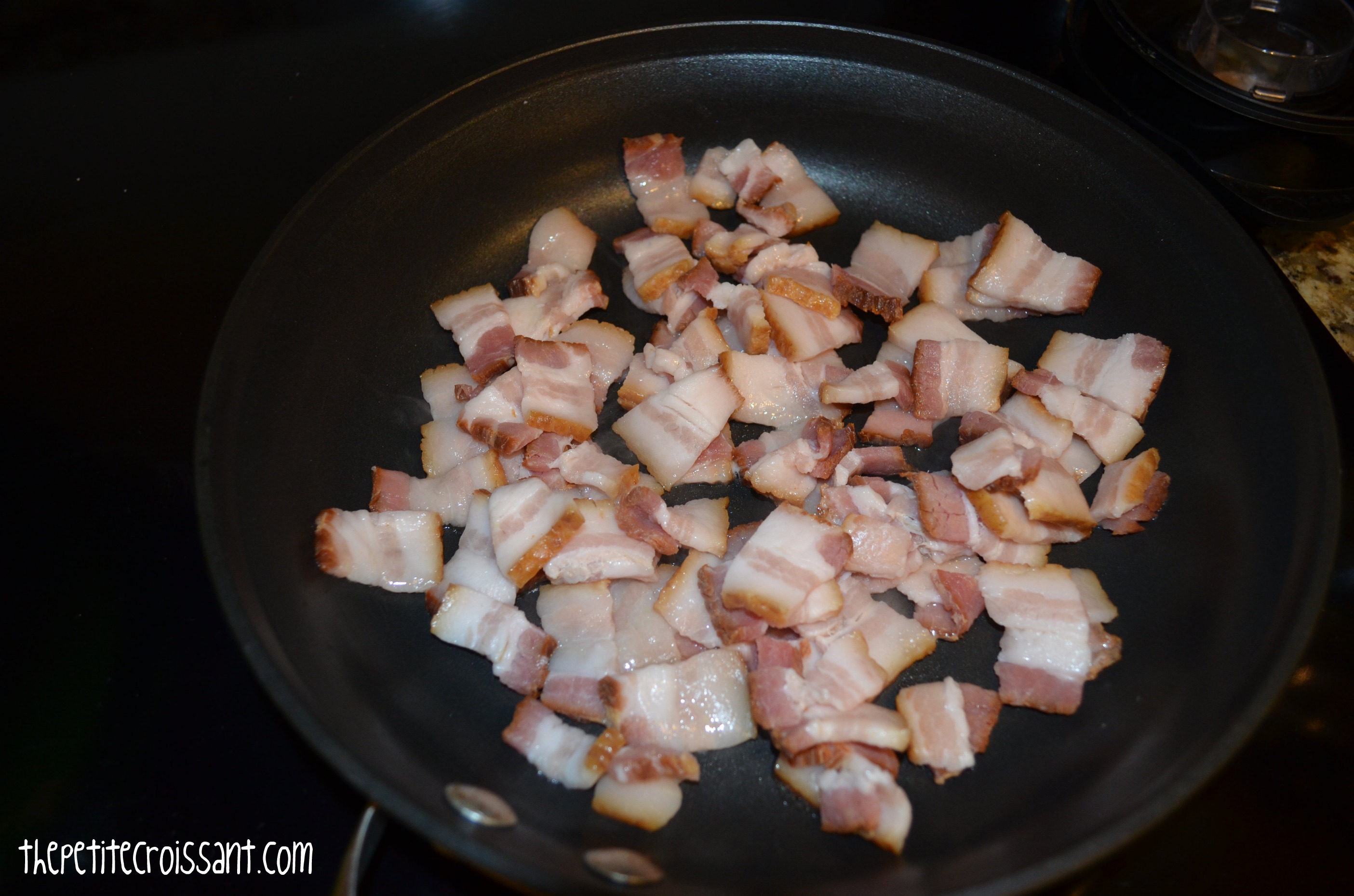 4. While the dough is rising, get your filling ready. Cut up the bacon into small pieces and cook on the stove in a frying pan for 10 minutes, or until they are cooked the way you like. Let them dry on a paper towel.
