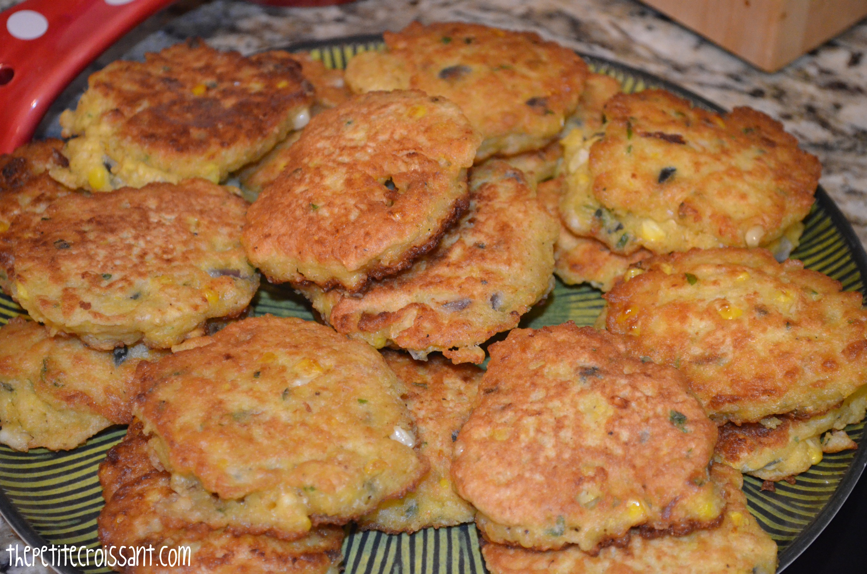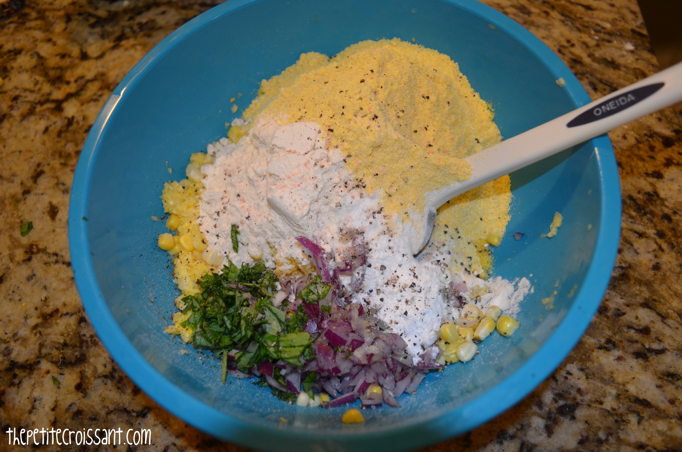 2. Place flour, cornmeal, onion, basil, baking powder, baking soda, salt and pepper into the bowl with the corn. Mix well. Add the eggs, buttermilk, and butter and mix until incorporated. Don’t over mix. I did the previous steps in the morning, and then covered the bowl and placed it in the fridge at this point. I then removed it from the fridge 20 minutes before I planned to cook the cakes.
