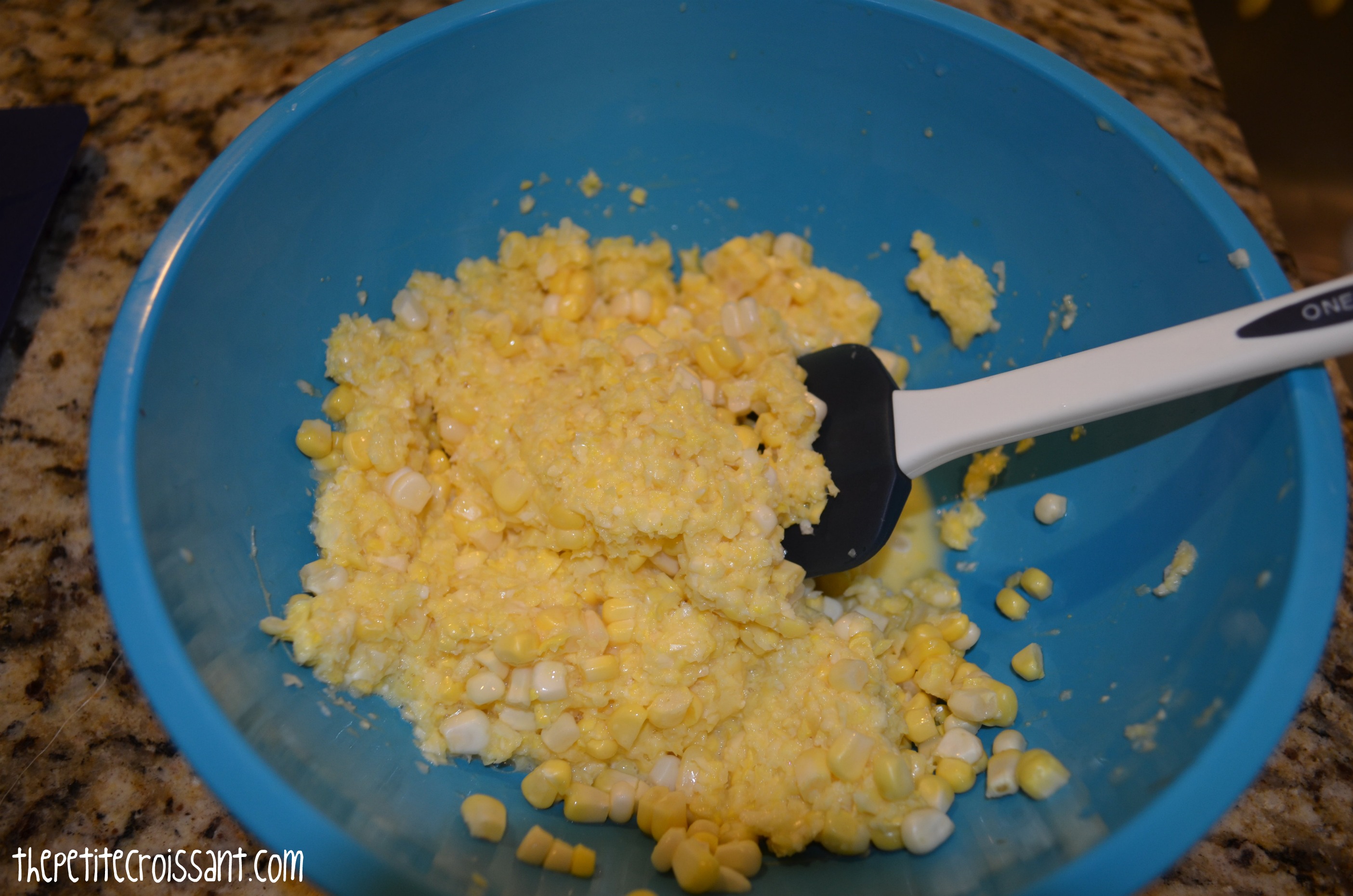 1. Cut the corn off the cobs. Place 2 cups of the kernels in a food processor, pulsing until they are almost pureed. Place into a bowl with the rest of the corn kernels.