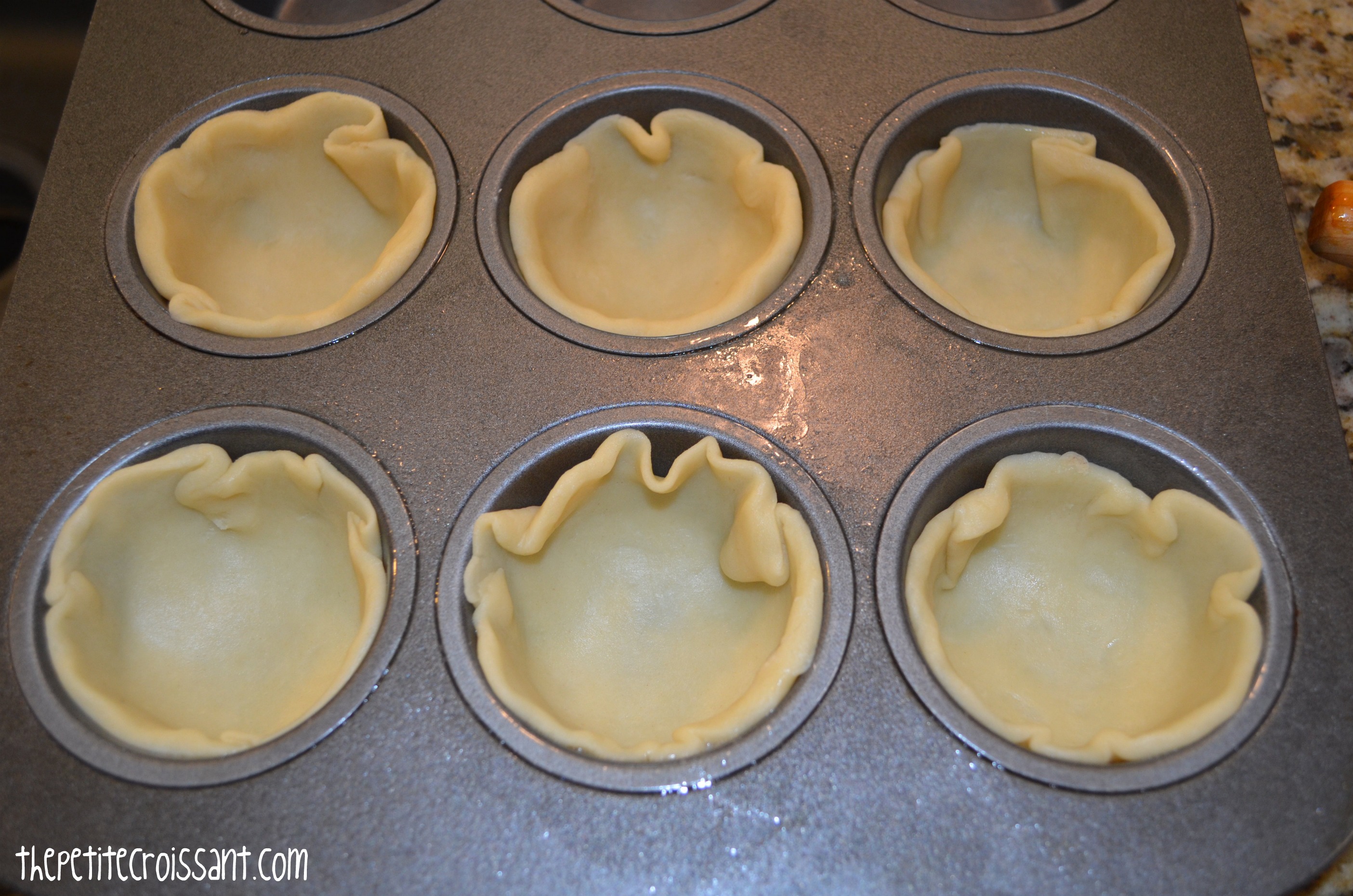 2. Roll out your pie crust. Use a cookie cutter (or cup) to cut 12 circles out. Use your fingers to fit these into the muffin pan. Make sure you’re making these circles big enough to fill the muffin pan (and go almost all the way up the sides).