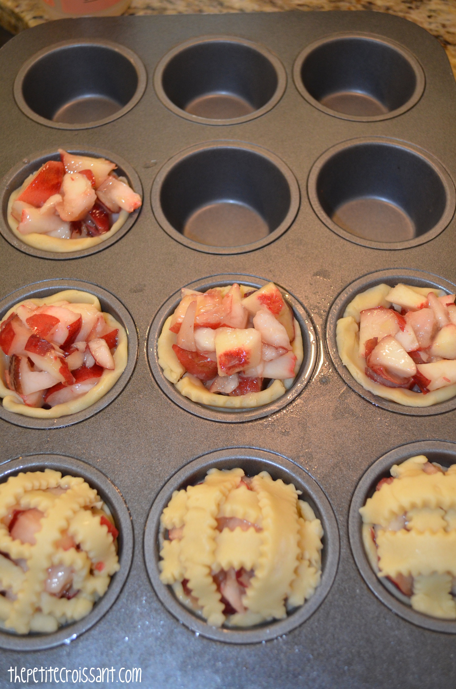 5. Now use your remaining pie crust to cover the tops. You can do lattice designs, full circles (but poke holes with a fork if you do that), or other shapes.