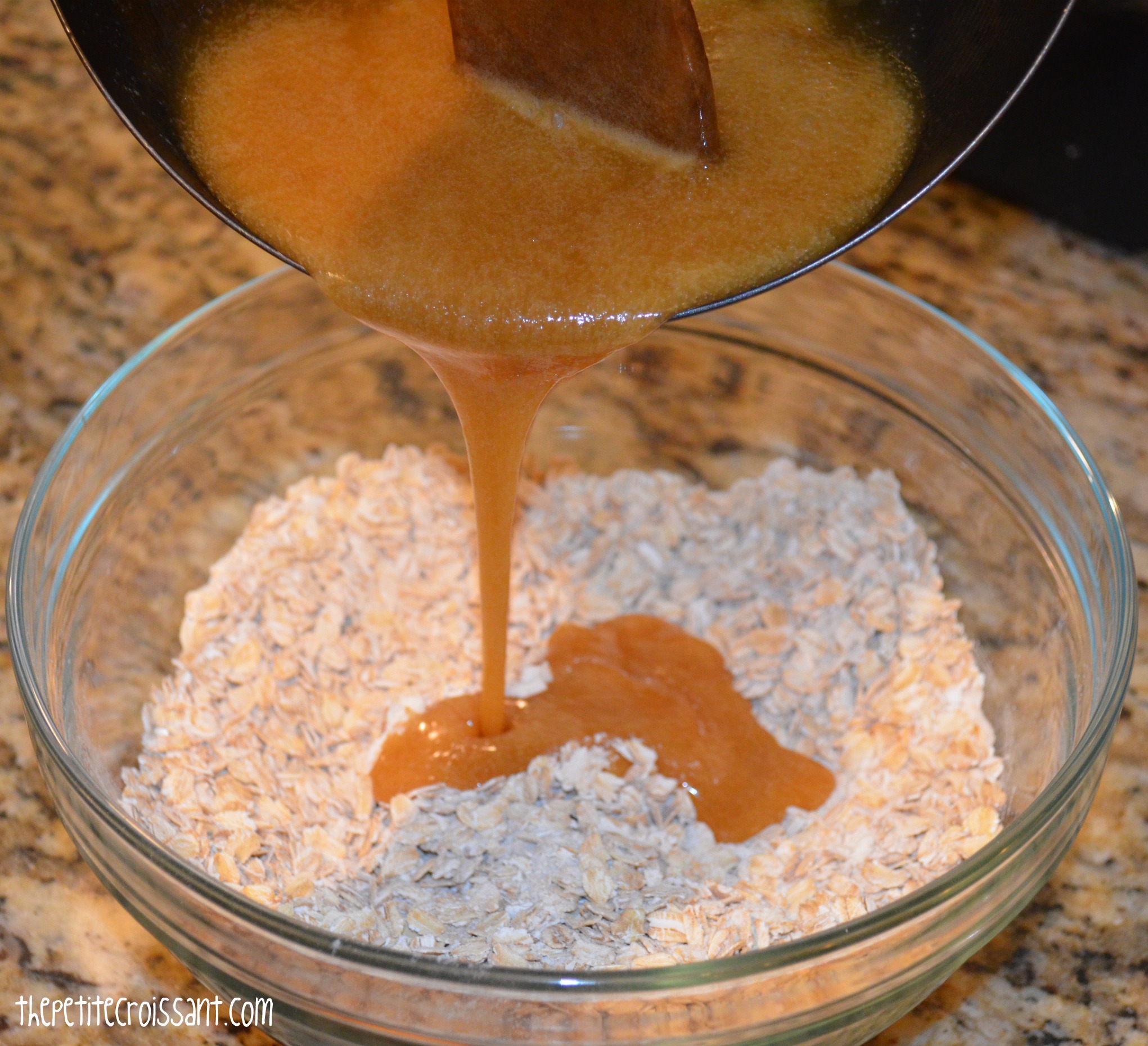 3. While the apricots are sitting, make your crust. Mix the oats and flours in a large bowl and mix well. Place the stick of butter, 1/2 cup honey, and brown sugar in a saucepan over medium heat and bring to a boil. Cook for 5 minutes and then pour this over the oat and flour mixture. Stir to coat all of the oats and then let cool.