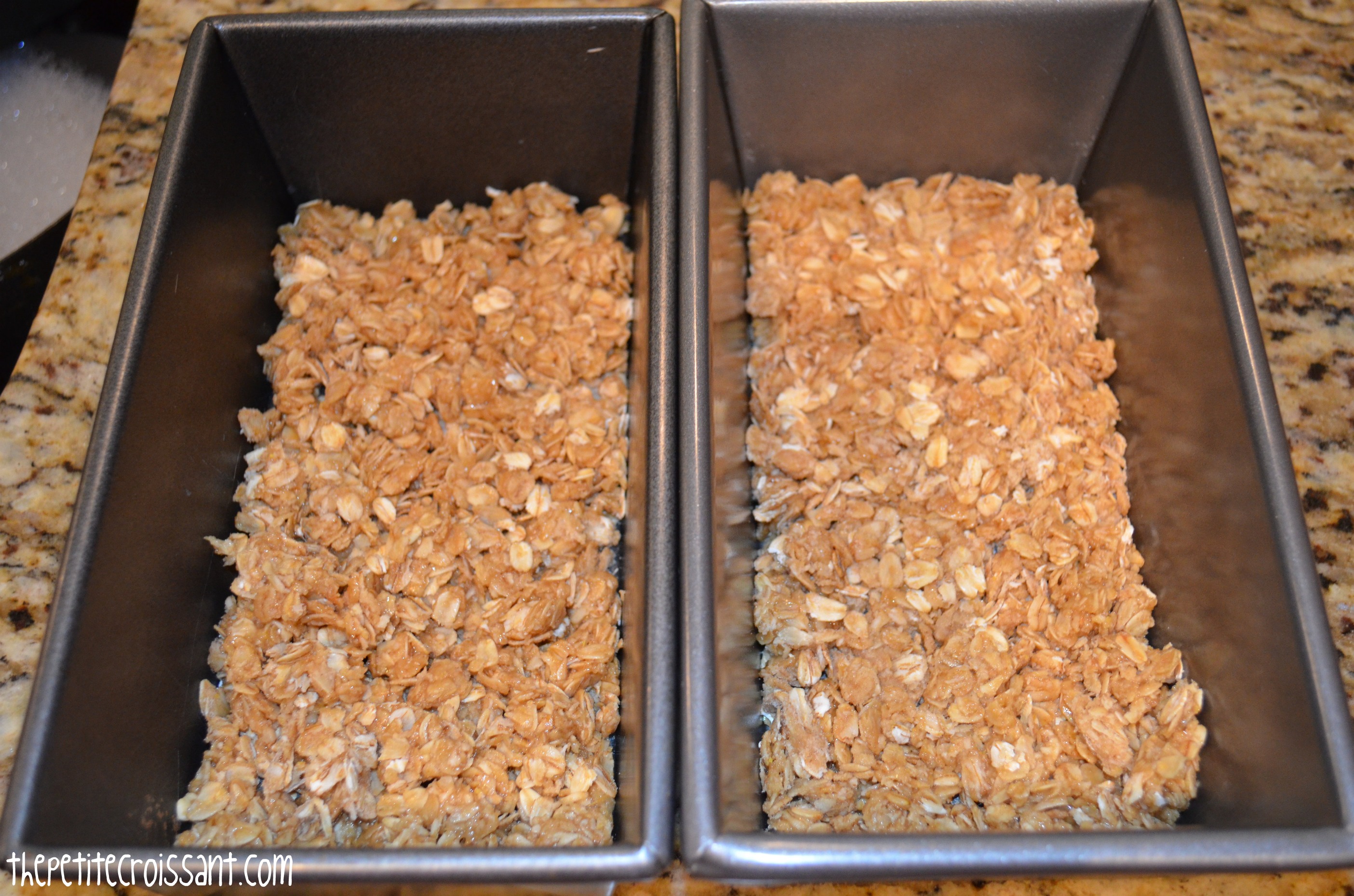 4. Once the oats have cooled, place half of the mixture (1 1/2 cups) into the bottom of the pan. Press down evenly and then set aside.
