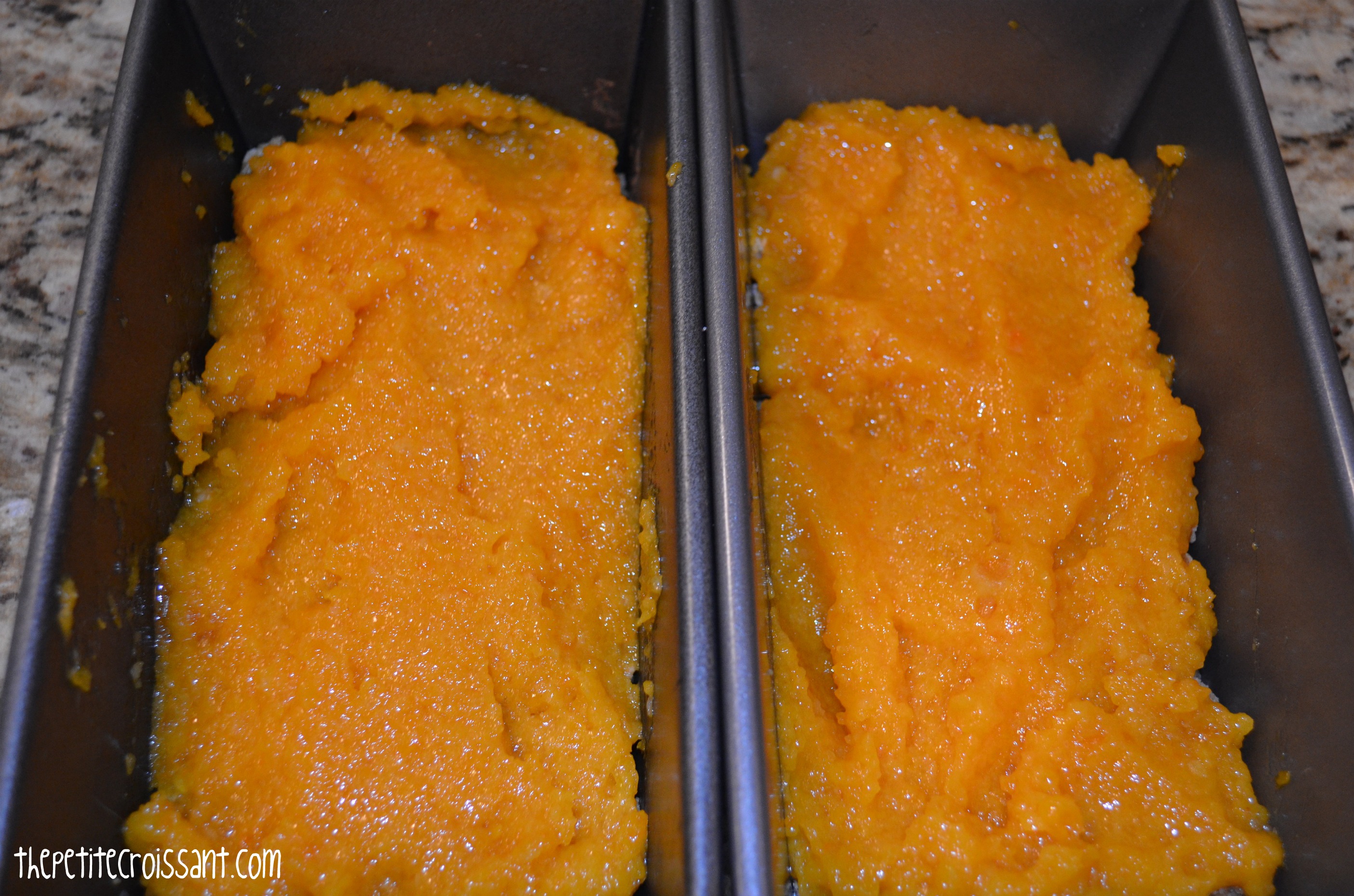 1. Preheat the oven to 350 degrees. Prepare your 8 x 8 baking dish with butter or cooking spray. Note: I was already using my square baking dish for something else, so I baked these in two bread pans.
