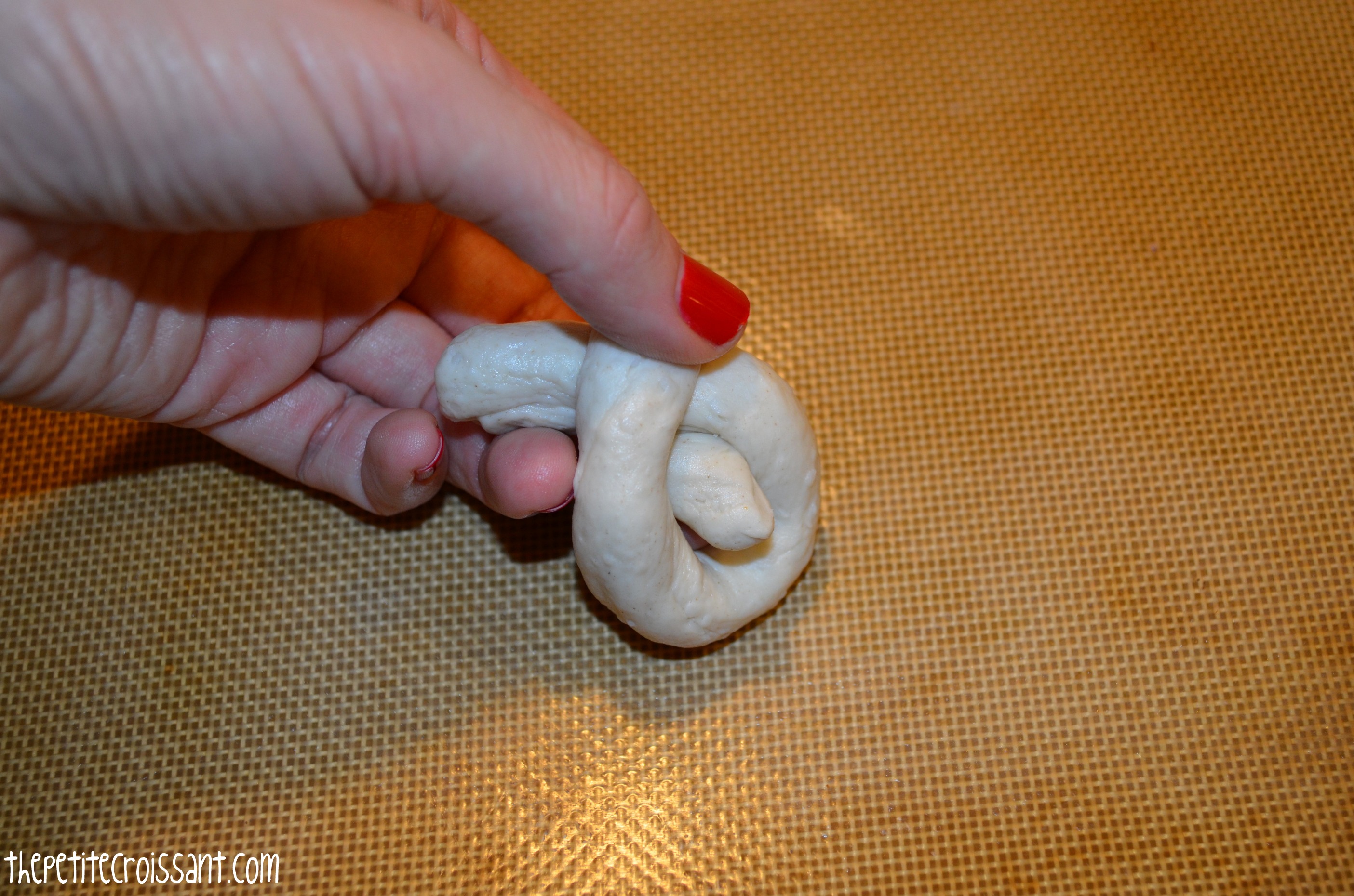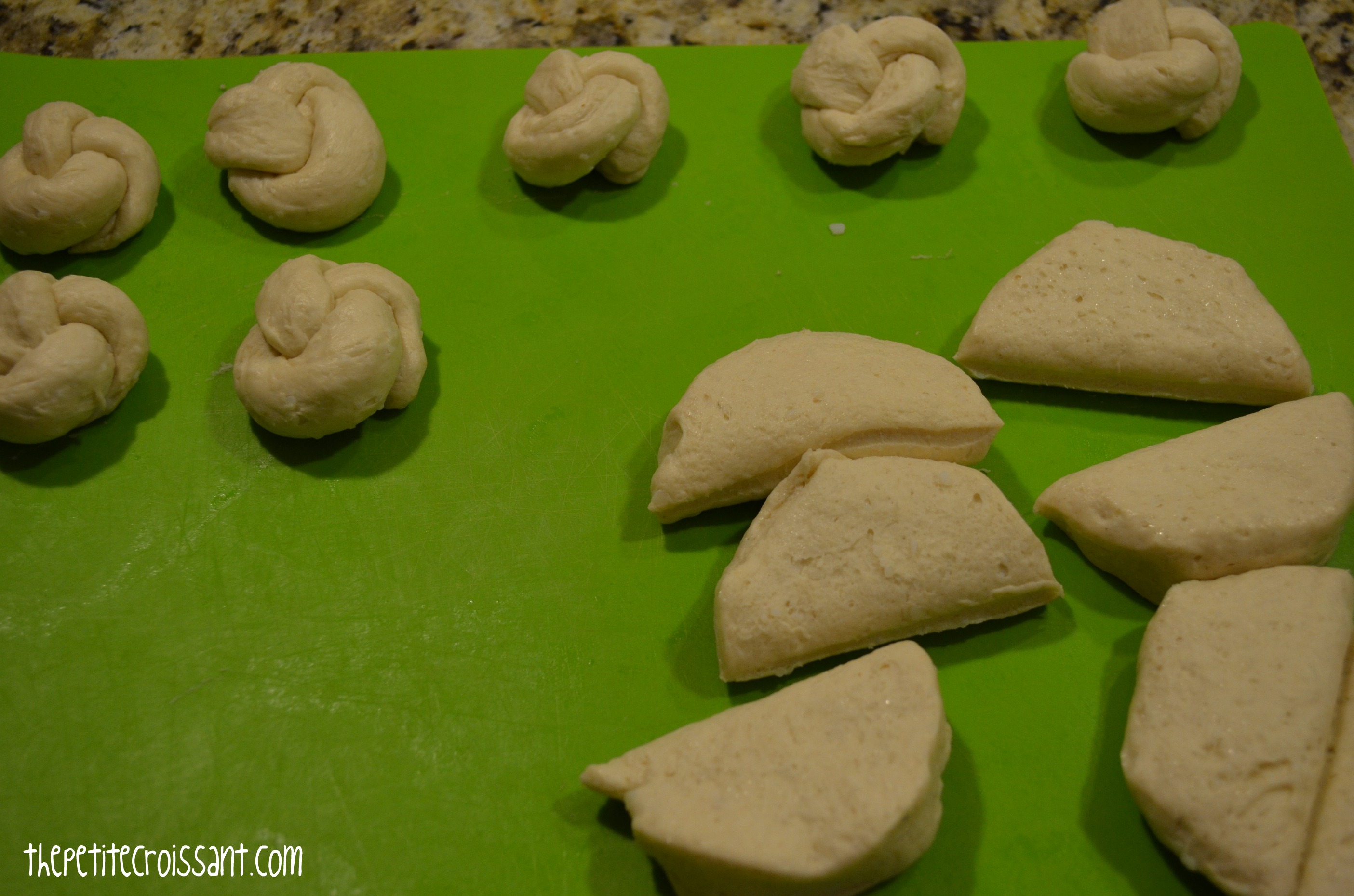 1. Preheat the oven to 400 degrees. Cut the dough into 10 separate pieces. Roll each into a long rope (10-12 inches). Tie the dough into a knot, and squeeze the end together.