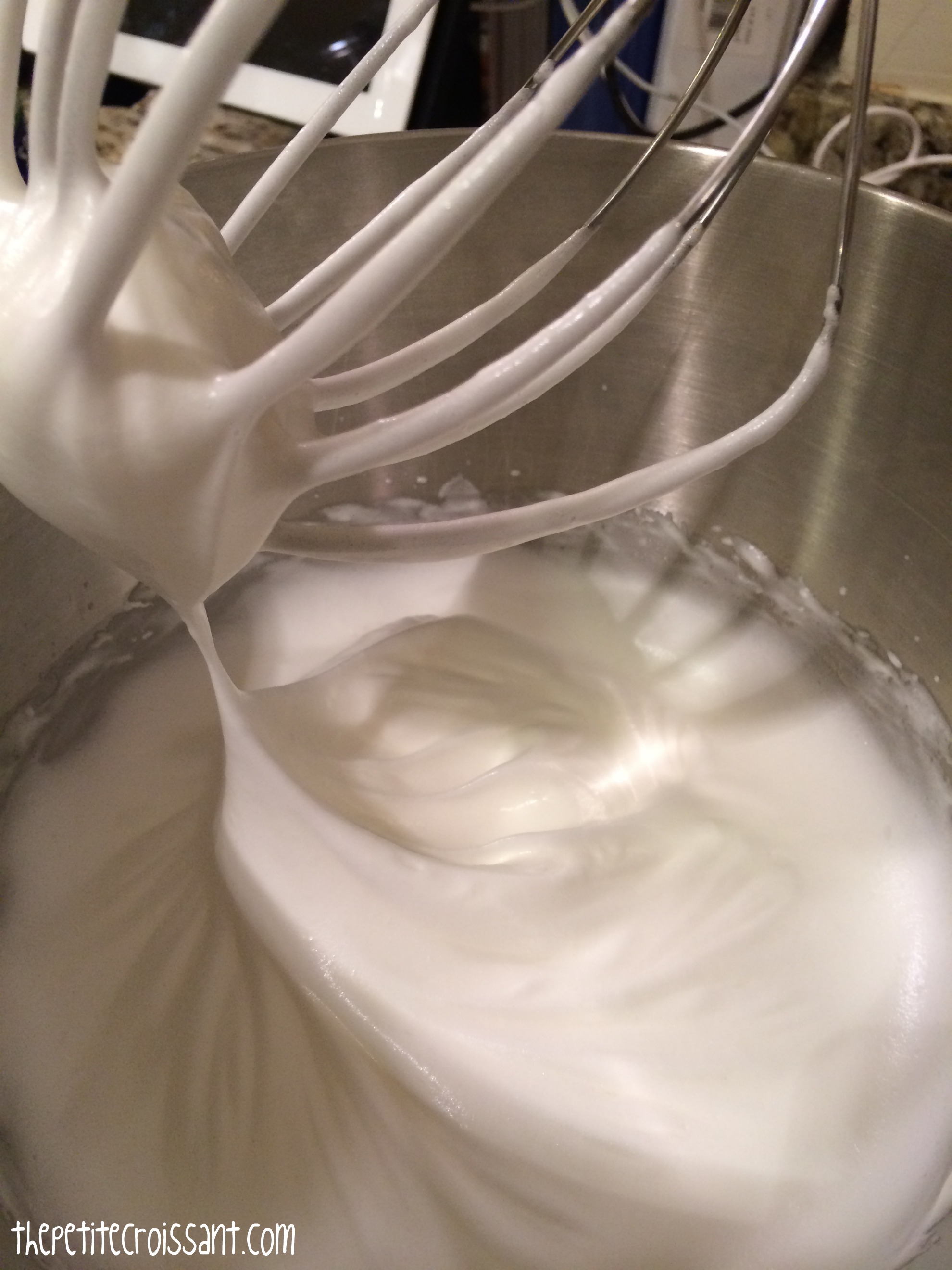 3. In the bowl of your stand mixer fitted with the whisk attachment, beat the egg whites with a pinch of salt. Once the eggs start to foam, add the sugar and continue beating until they make stiff peaks. You will know there are stiff peaks when you lift up the whisk and the eggs are still standing in peaks. Add the remaining egg yolks while the mixer continues to mix.