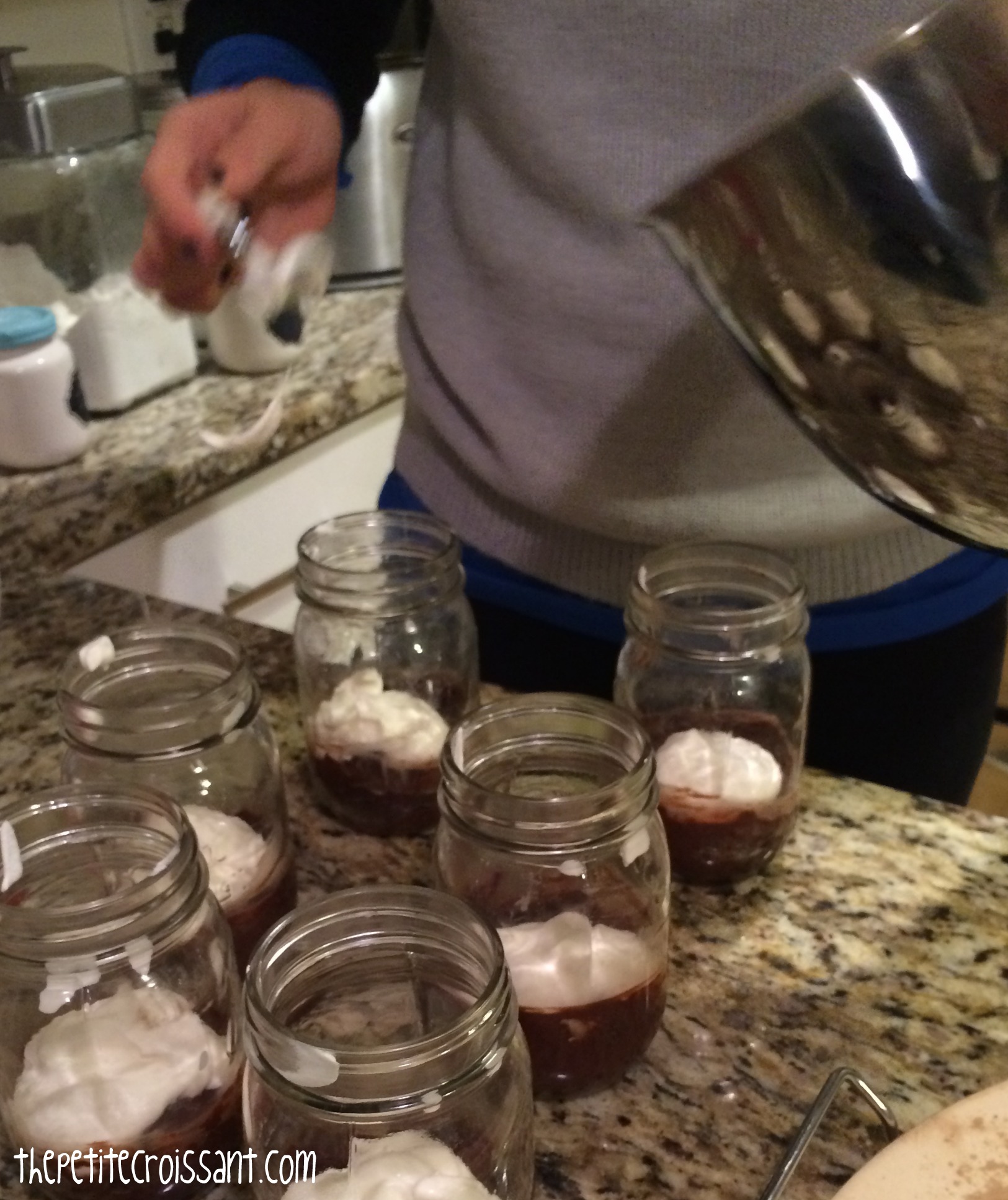 5. Now place the chocolate mousse into individual serving containers. I used mason jars but you could also do ramekins or any small bowl you have. Place the mousse in the fridge until about an hour before you want to serve. You can chill it overnight if you want to make it in advance. Before serving, add a dollop of whipped cream. To make whipped cream, place the whipping cream and a pinch of sugar in the stand mixer fitted with the whisk attachment and mix on high until it makes peaks (just like before).