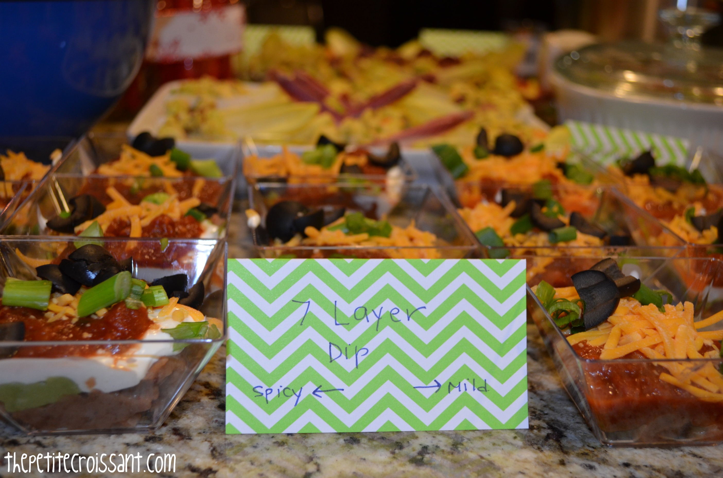 Next up in my Wednesday party appetizer posts: 7-Layer Dip. I live for 7-Layer Dip. I love bringing it to parties, and end up eating most of it. But, after a few people dig in, it starts to look messy, and kind of gross. So how do you solve this problem? You put them in individually sized cups. Plus, they’re so festive looking.