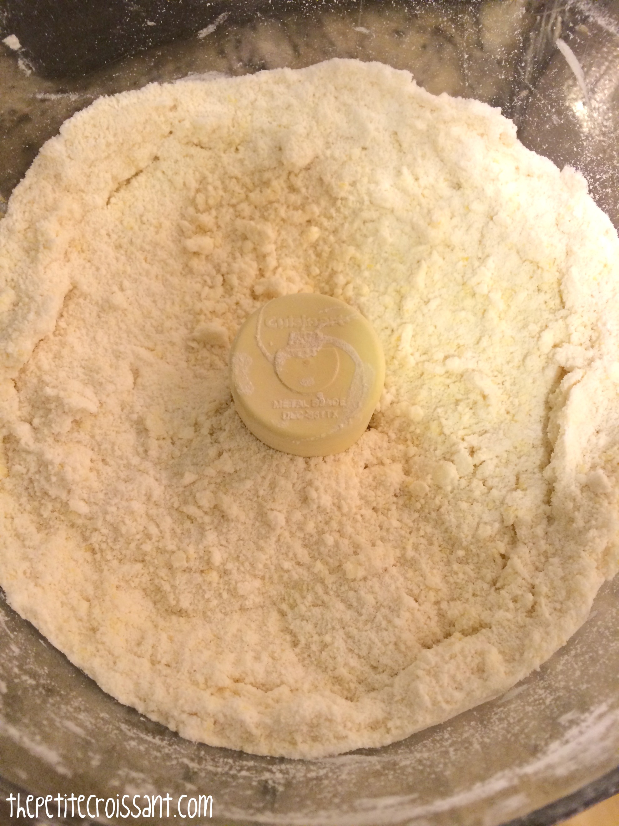 5. Now to begin the crust of the tart, mix the flour, sugar, and salt in a food processor. Add the butter and pulse several times. Add the yolk and pulse again until the dough clumps up.