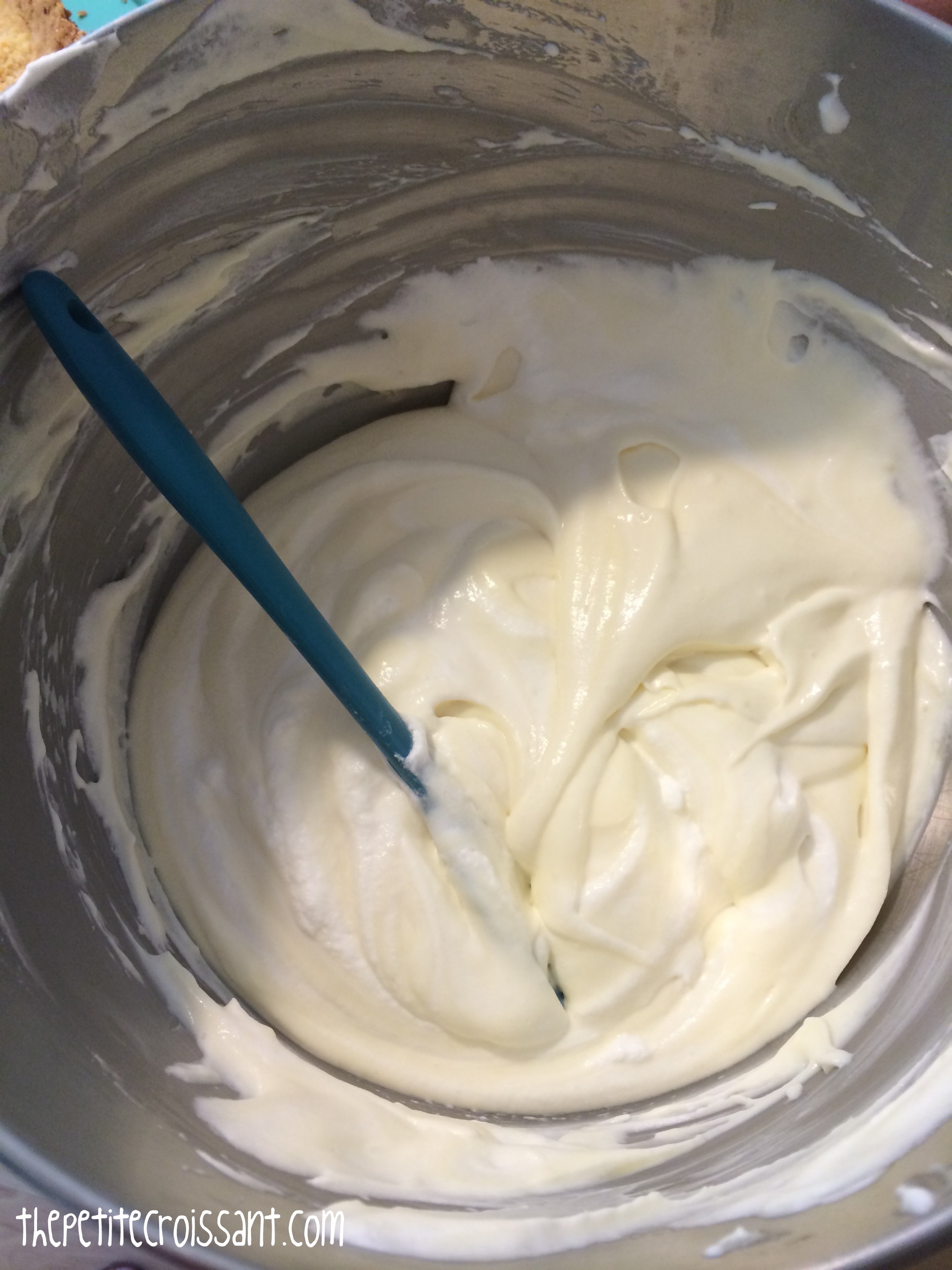 7. Now to prepare the mascarpone cream, mix the heavy cream in a mixer until stiff peaks form. Set aside. Now mix the pastry cream (which you previously whipped by itself until creamy) with the mascarpone until well combined. Fold in the whipped cream and chill until ready to put in the crust.