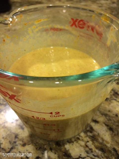 2. In a bowl or measuring cup, mix the coconut milk, peanut butter, lime juice, curry powder, and salt and use a whisk to mix.