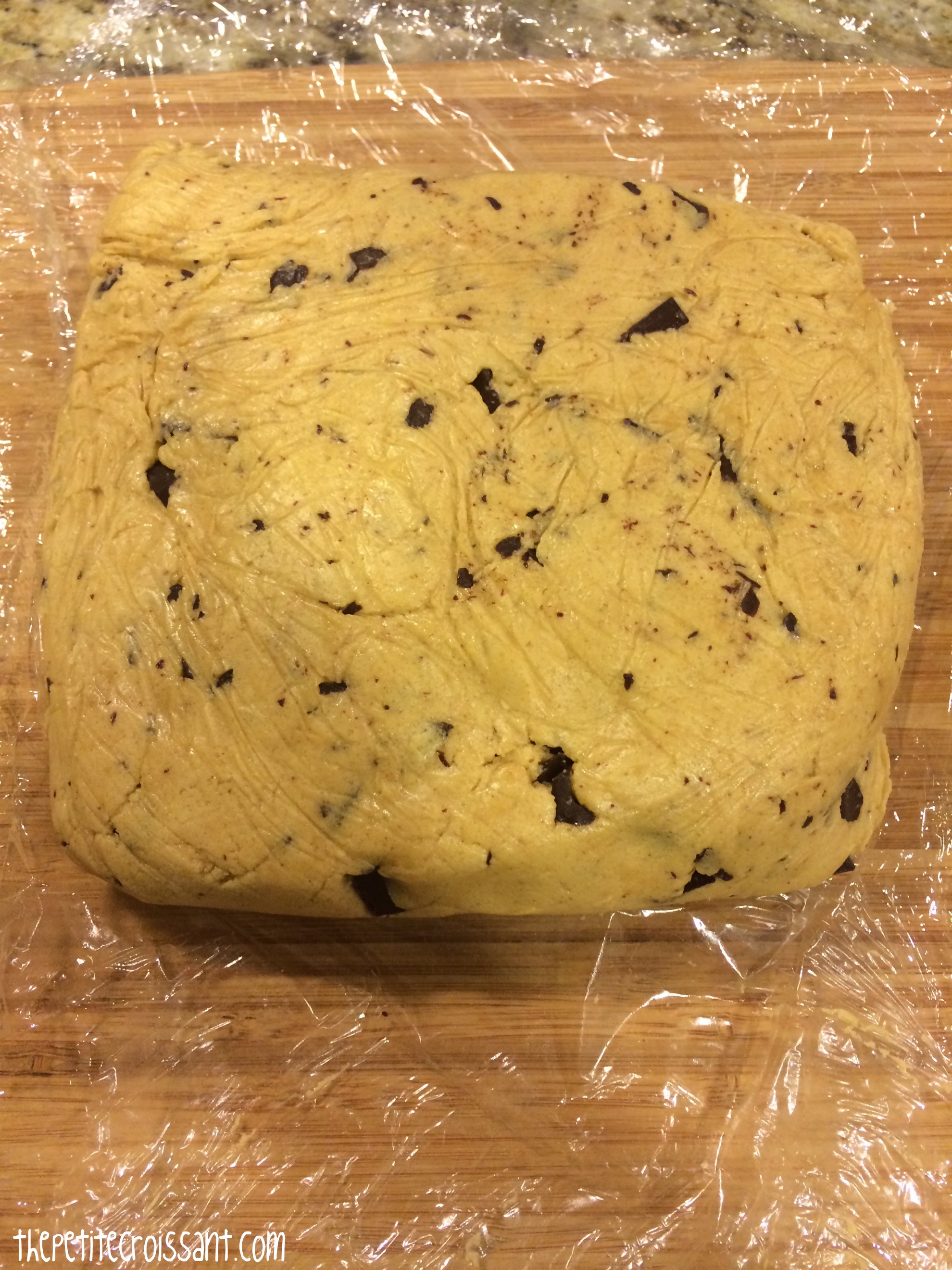 5. Now put the dough in plastic wrap and keep in the fridge for 30 minutes. At this time, also preheat your oven to 350 degrees and prepare two baking pans by lining them with parchment paper (or silicone liners).