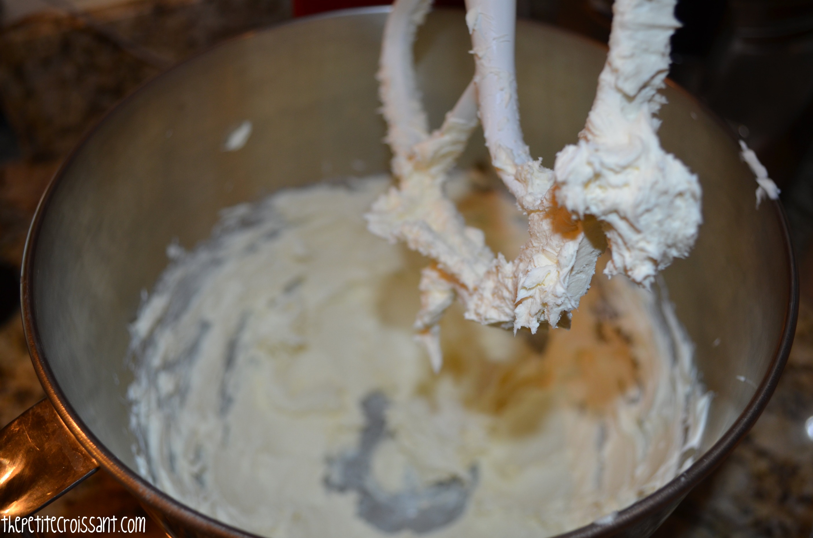 4. While the cupcakes cool, make the frosting. In the bowl of the stand mixer fitted with the paddle attachment, beat the cream cheese and butter until smooth. Add the powdered sugar and 1 tablespoon of milk. Beat again. Add the vanilla and an additional tablespoon of milk if necessary to thin it out. Scrape down the sides.
