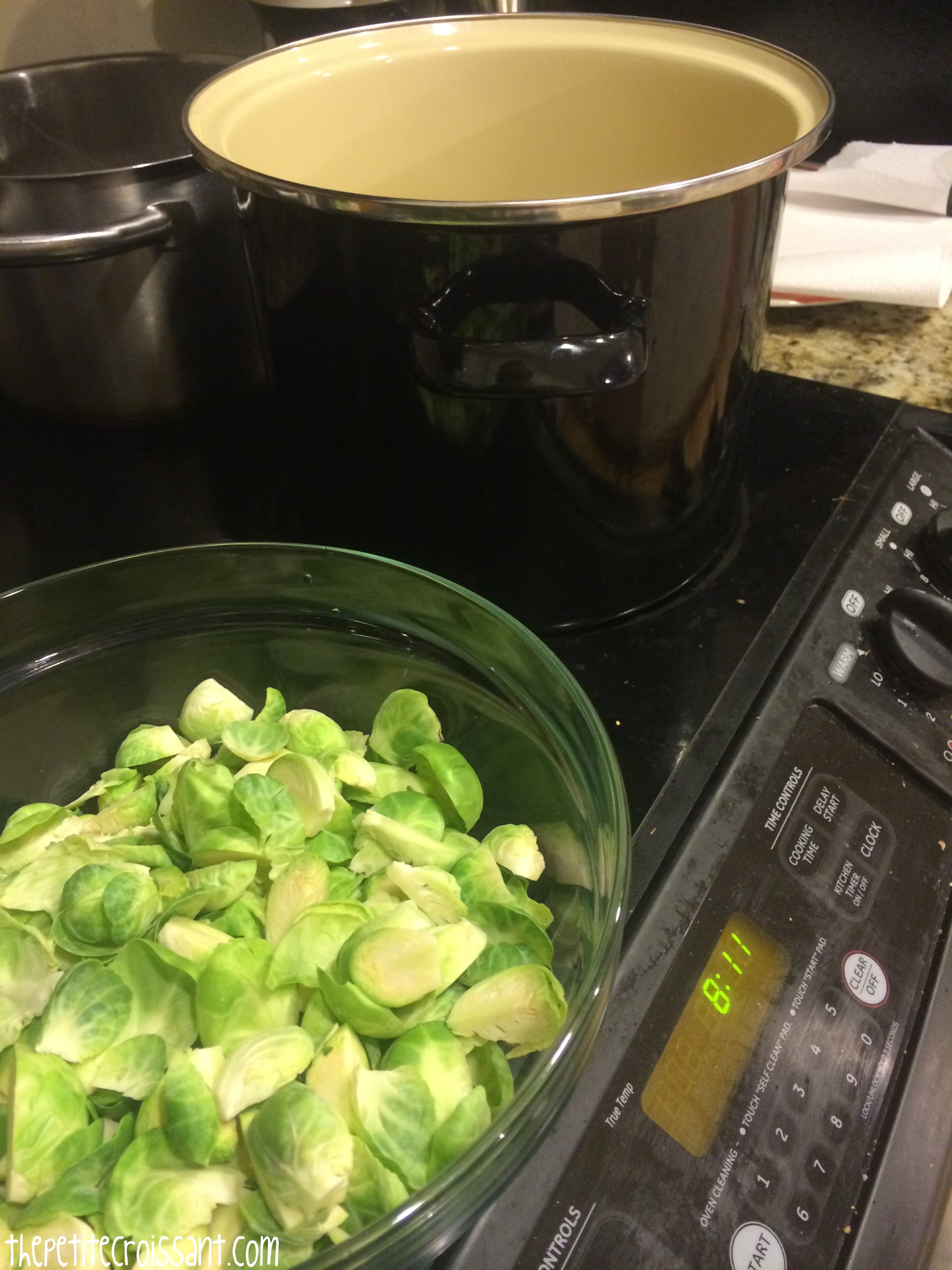 1. Cut the brussels sprouts in half. Pull off the loose leaves and add both the leaves and the hearts to a bowl.