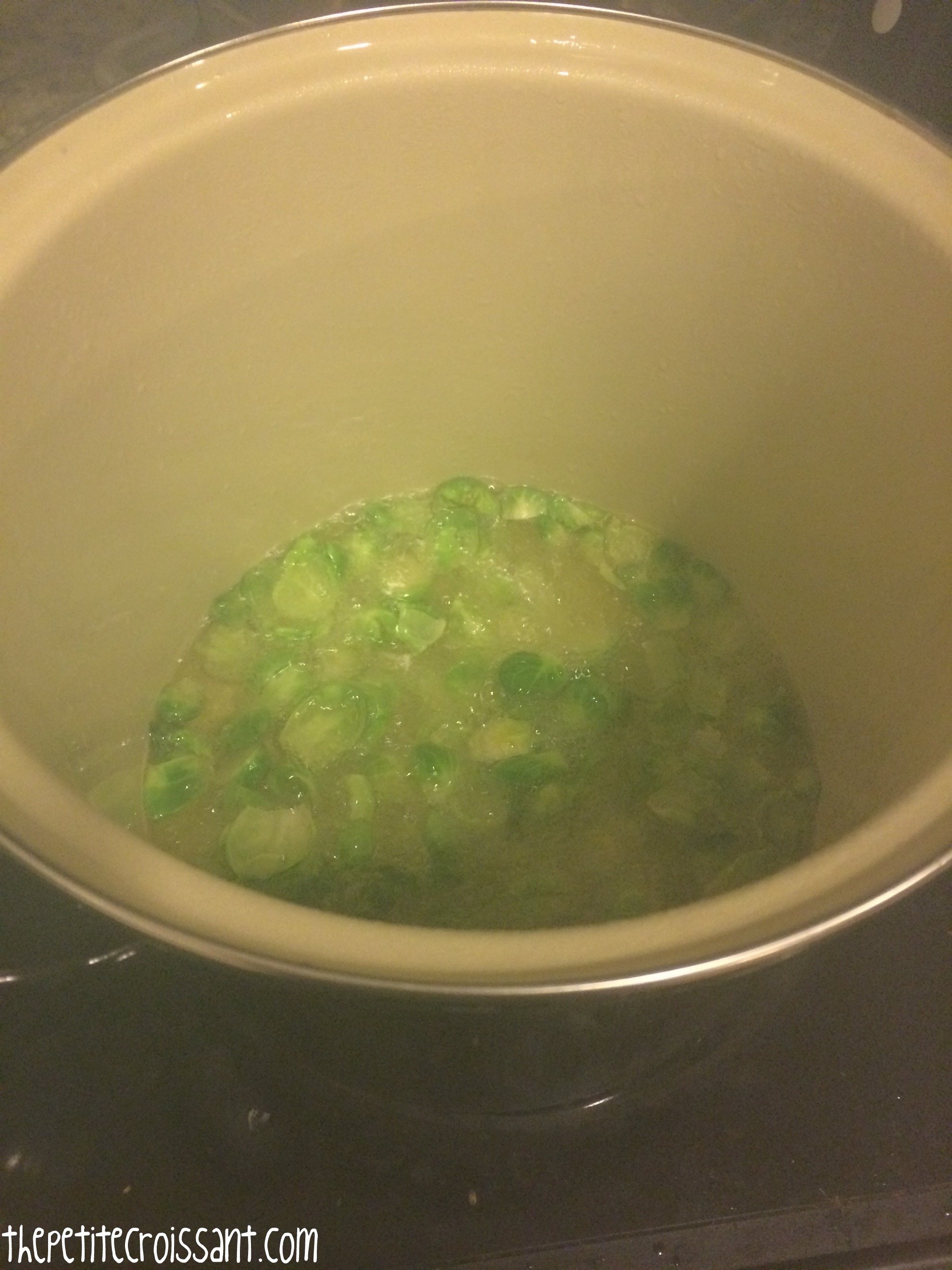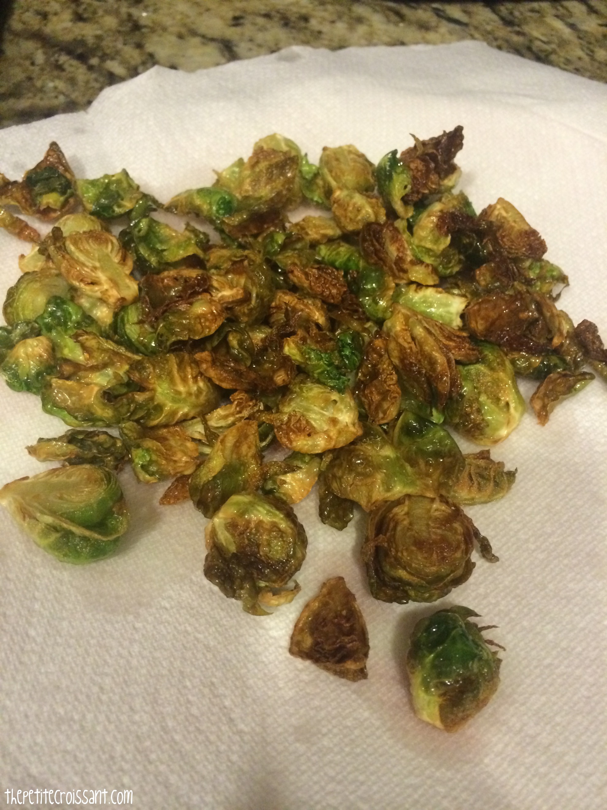 3. In a large pot on the stove, heat the oil over medium heat. To test if the oil is hot enough, add one brussels sprout leaf and see if it sizzles. Once the oil sizzles, add brussels sprouts to the pot in batches. Be really careful with the hot oil so that it doesn’t splatter up and burn you! I generally wear a glove (the kind you wear when removing something hot from the oven) on my hand as I drop in the veggies with a spoon into the pot, and keep my head away. Let the veggies cook for 30-60 seconds, and then remove with a slotted spoon and place them on a paper towel. Continue until they are all cooked.