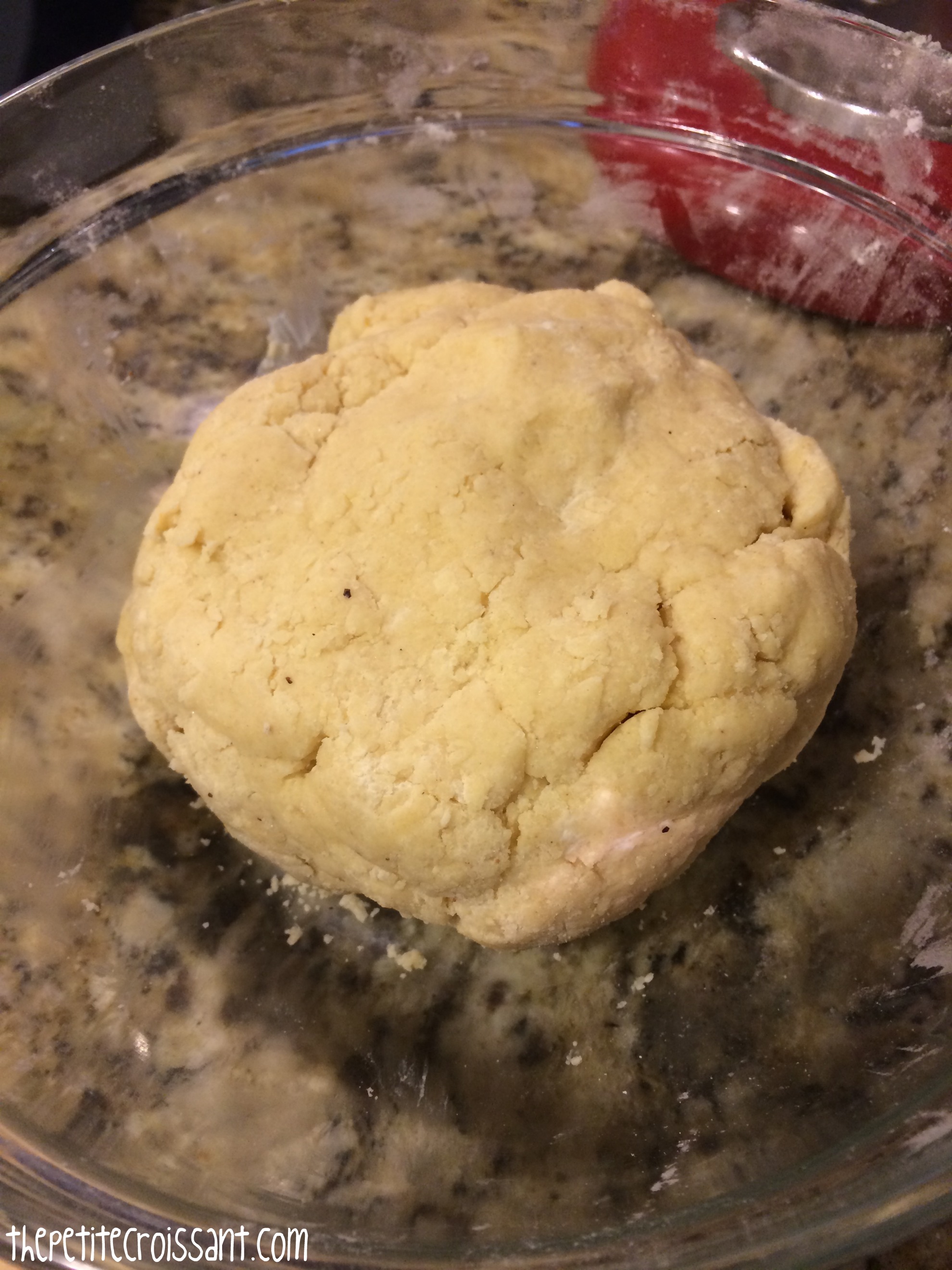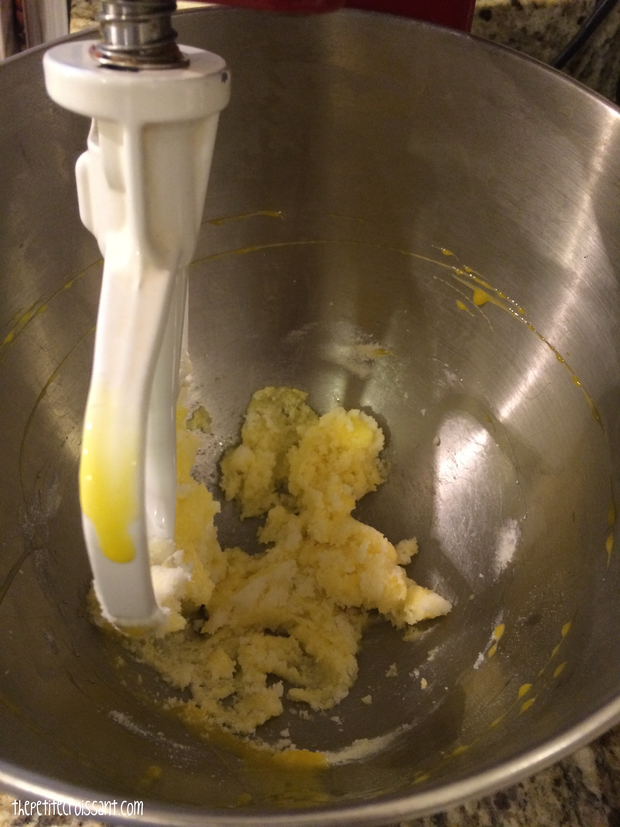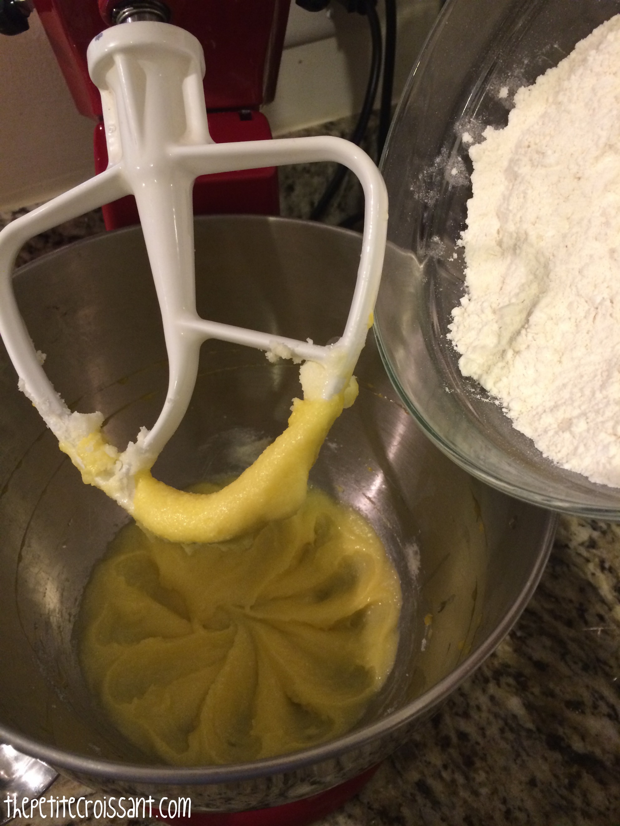 2. In your electric mixer, cream the sugar and butter using the paddle attachment. Add the egg yolks and then scrape down the sides of the bowl. Now add the dry mixture and the sour cream, alternating until it is all added. Cover the bowl of your mixer with plastic wrap and place it in the fridge for one hour. The dough is sticky, so you need it to get firm so that you can roll it out.