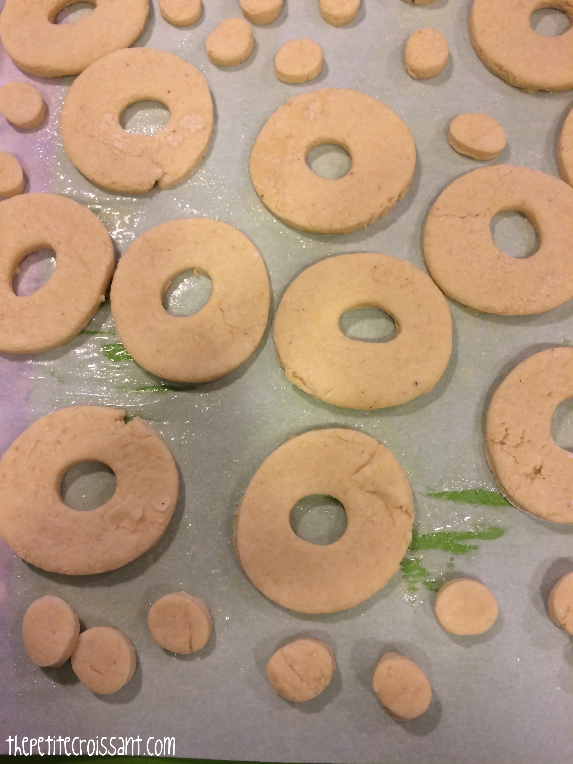 3. Once the dough has hardened, take it out of the fridge. Dust a cutting board (or your counter) with flour, and then roll the dough out until it is about a half inch thick. Now using cookie/donut/biscuit cutters, cut out approximately 12 donuts and 12 donut holes.