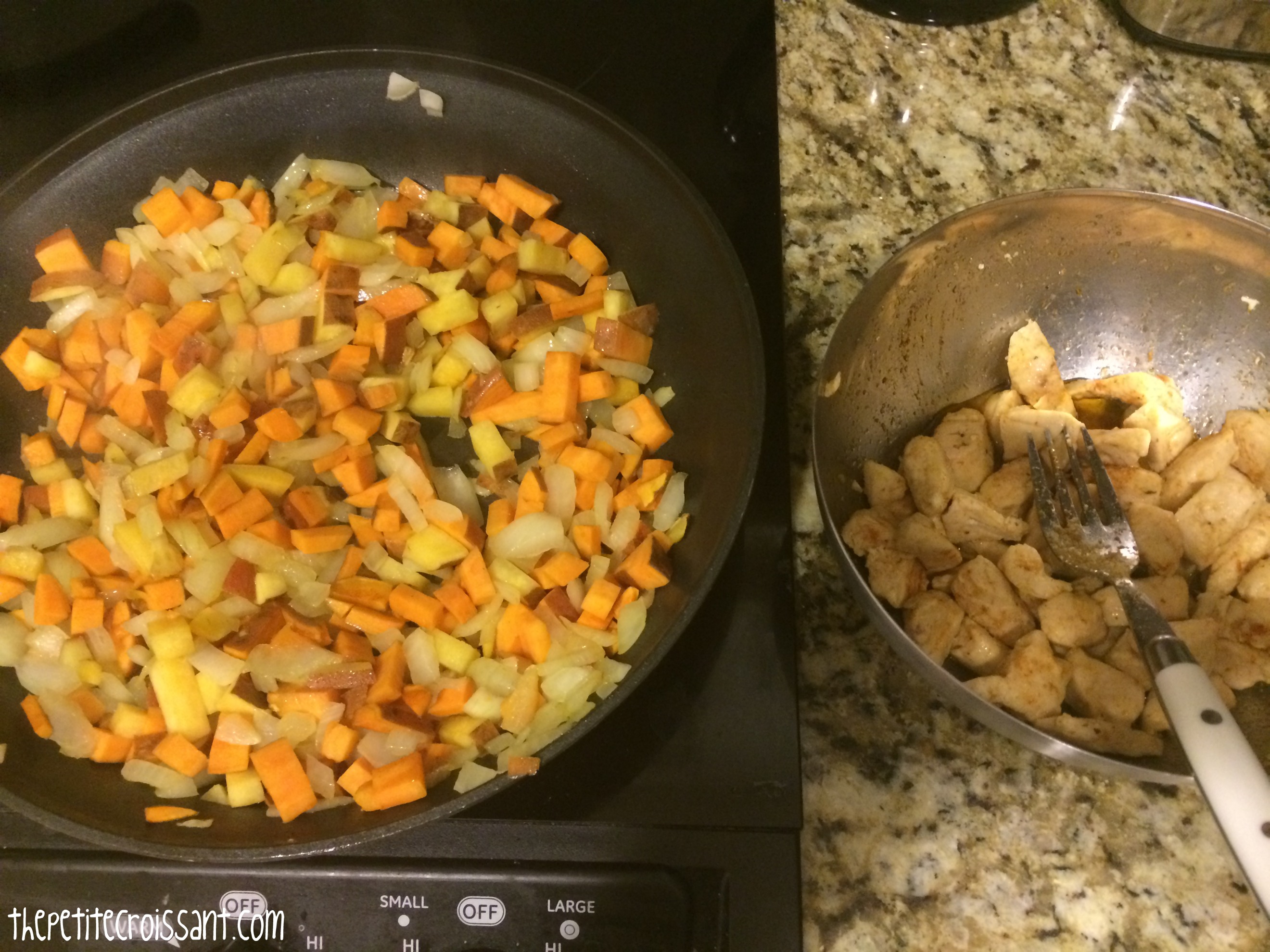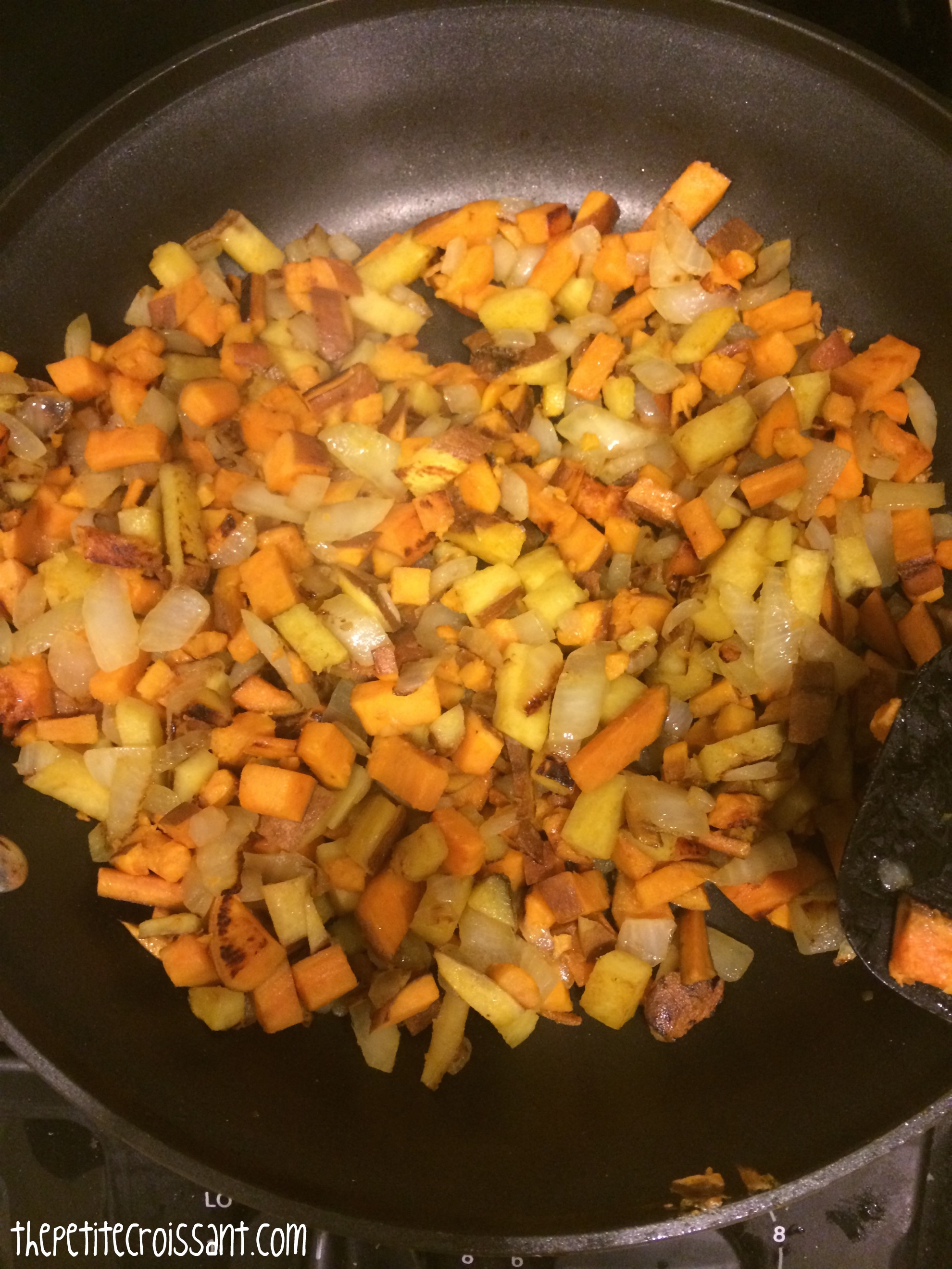 2. In the same pan, add some more olive oil. Once hot, add the sweet potato and onion. Cook until the potatoes are tender.