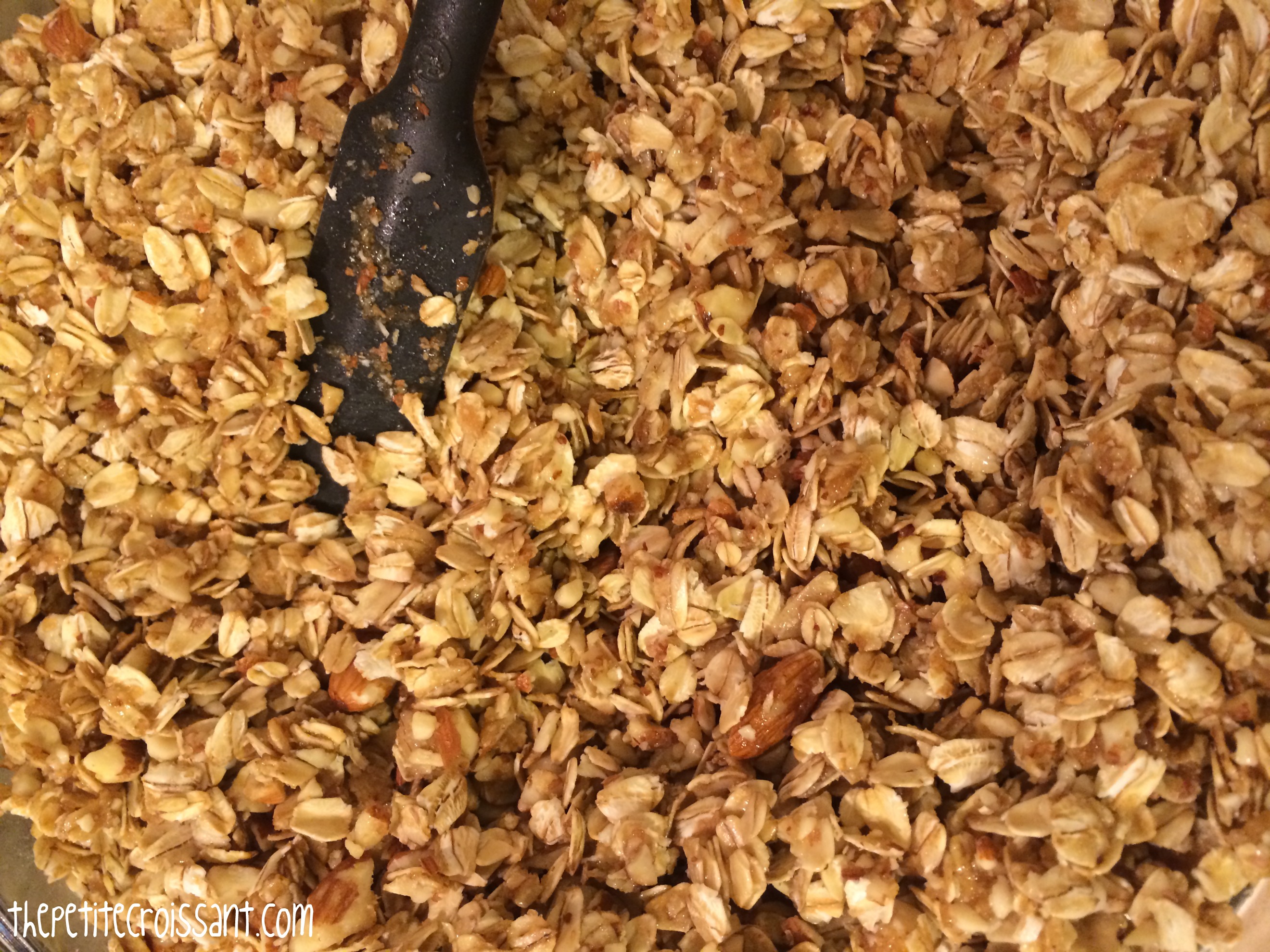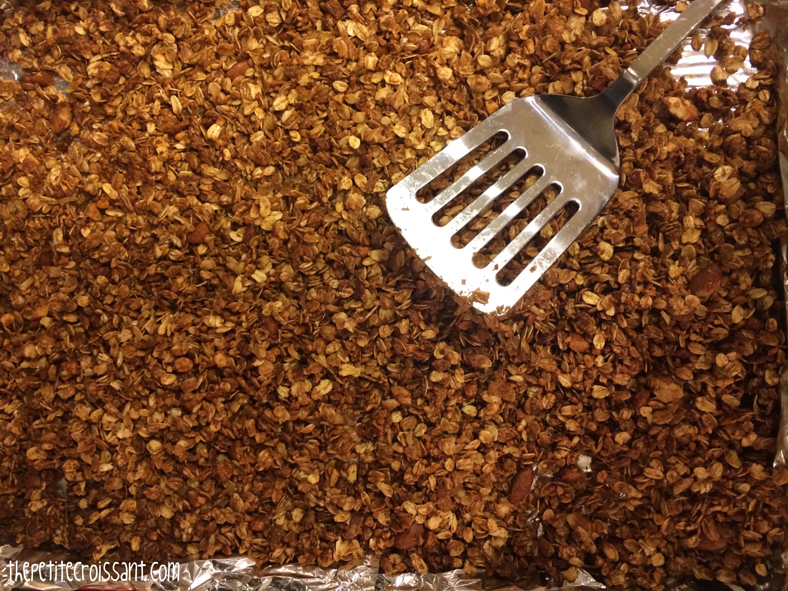7. After 5 minutes, use a spatula to mix up the granola, and return the pan to the oven and cook for 5-10 more minutes. The original recipe said 5, and will leave with you a very lightly cooked granola. I prefer mine to be a bit more cooked, so I did 10 more minutes.