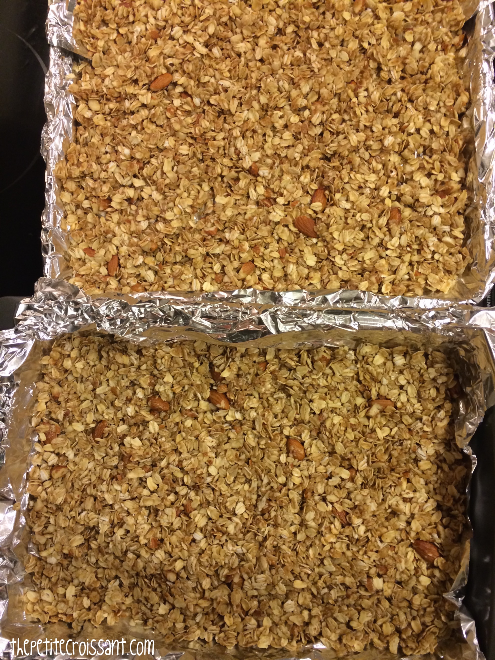8. Once the granola is cooked to your liking, remove it and let it cool before breaking it into pieces and removing it from the pan. Store in an airtight container. It will probably last up to a week in this container, but we always finish eating it before then.