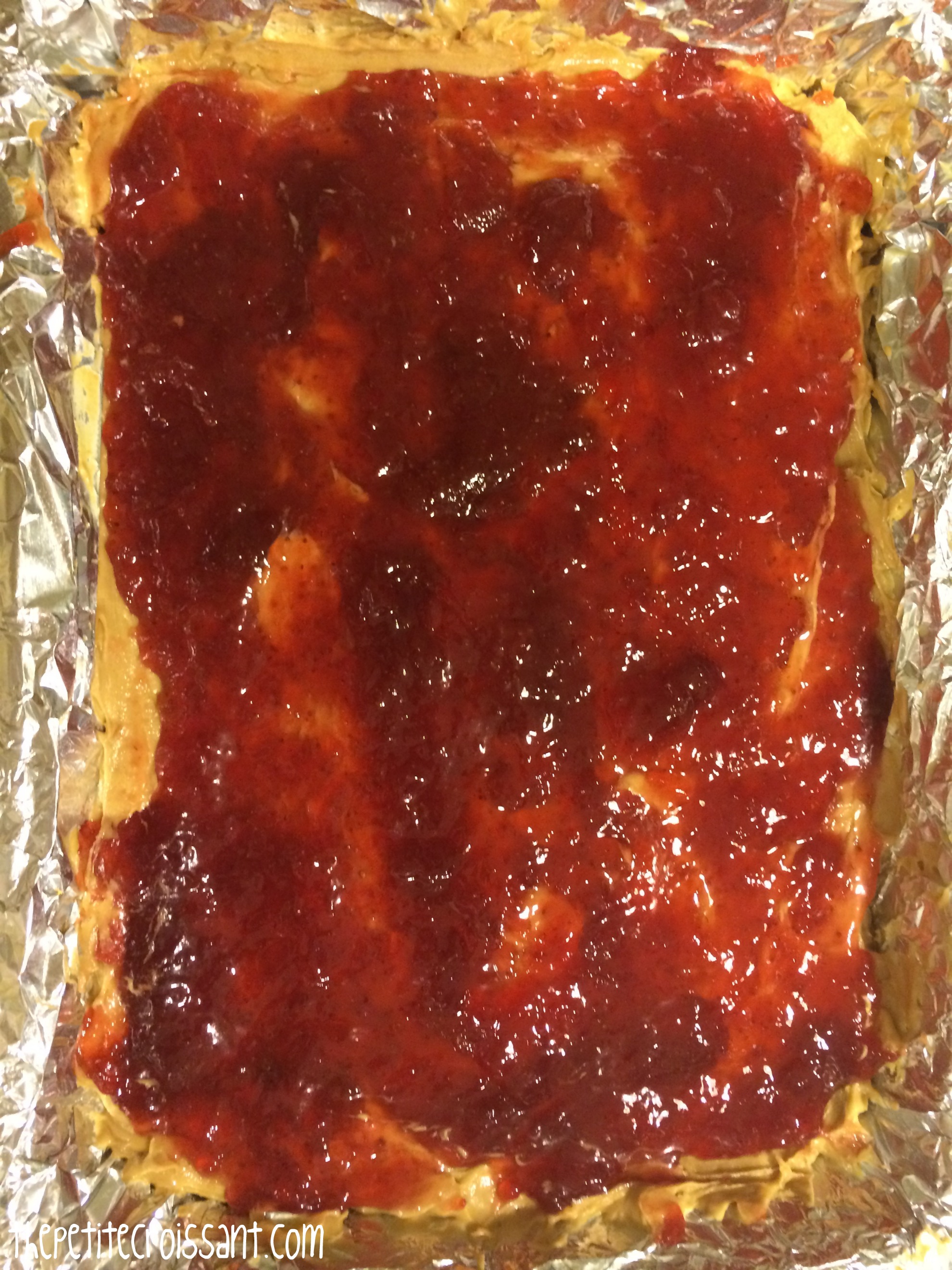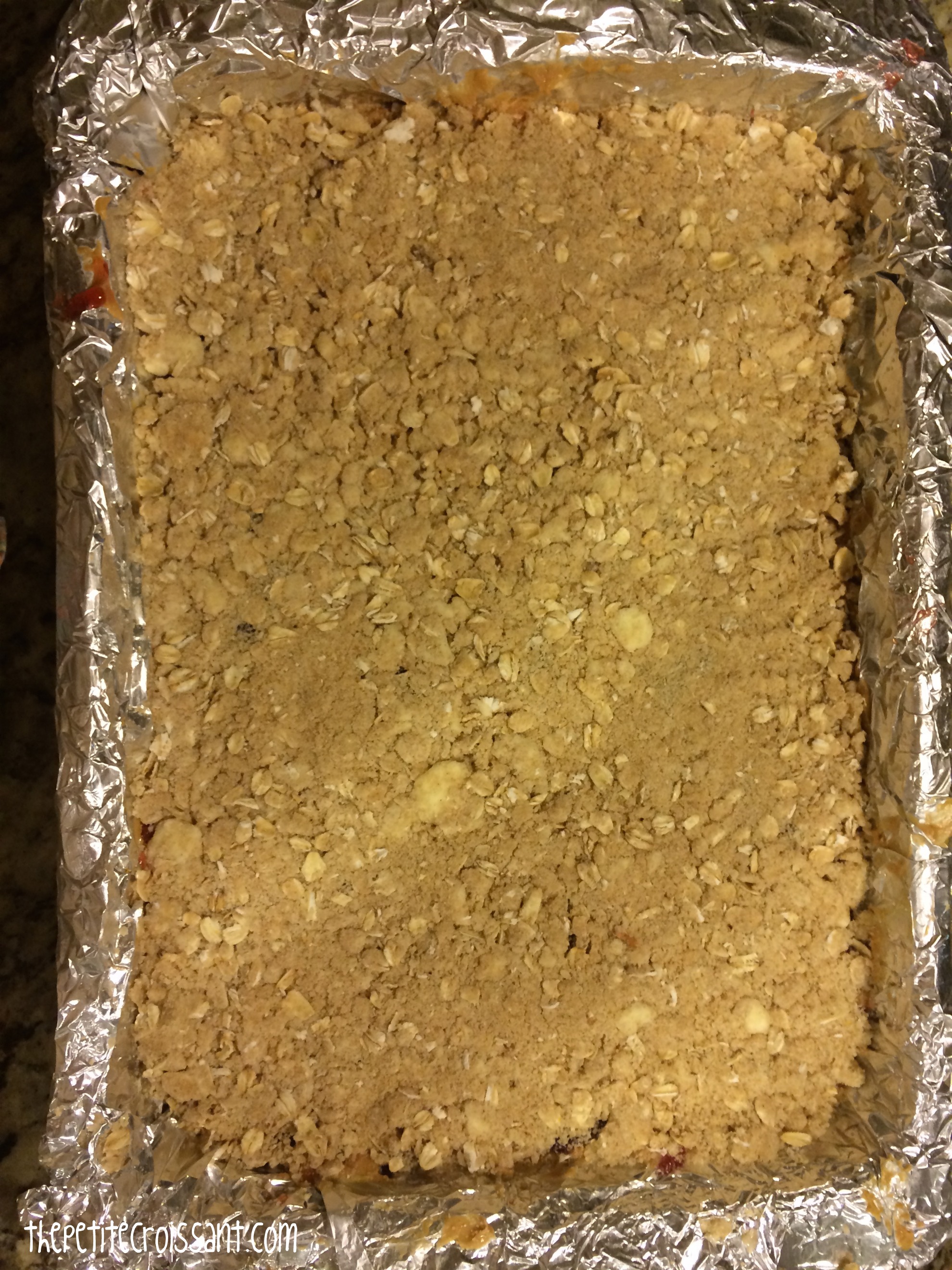 6. Now spread the jelly on top of the peanut butter, and then top with the crumb topping. Press down. Place in the oven and bake for 20 minutes.