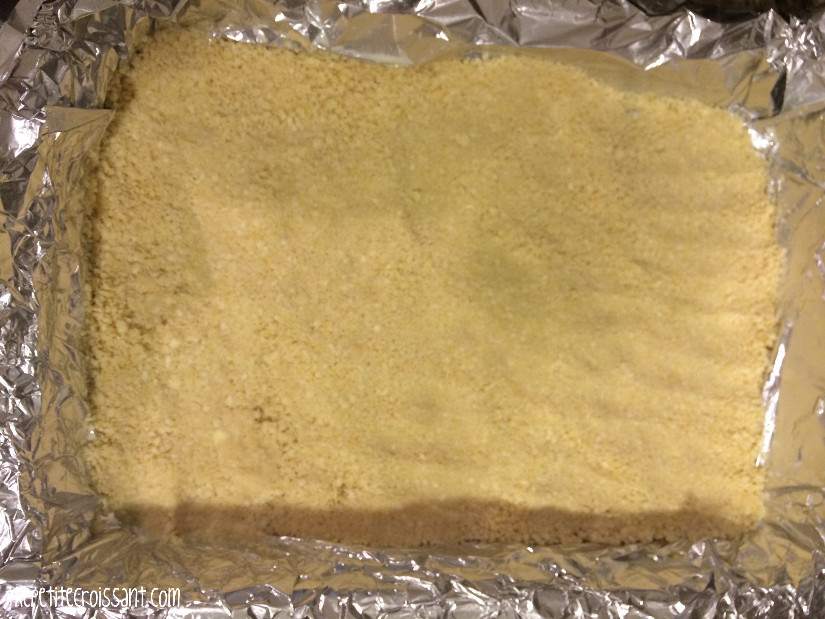 3. Cover the dough with foil, and place another pan on top to hold it down (or use pie weights if you have them but I did not). Bake the dough for 15 minutes. Then remove the top pan or pie weight and bake for 5 more minutes, but keep an eye on it to make sure the dough doesn’t start to brown. Lower the oven temperature to 325 degrees, and let the dough cool on the counter while you make the peanut butter filling.