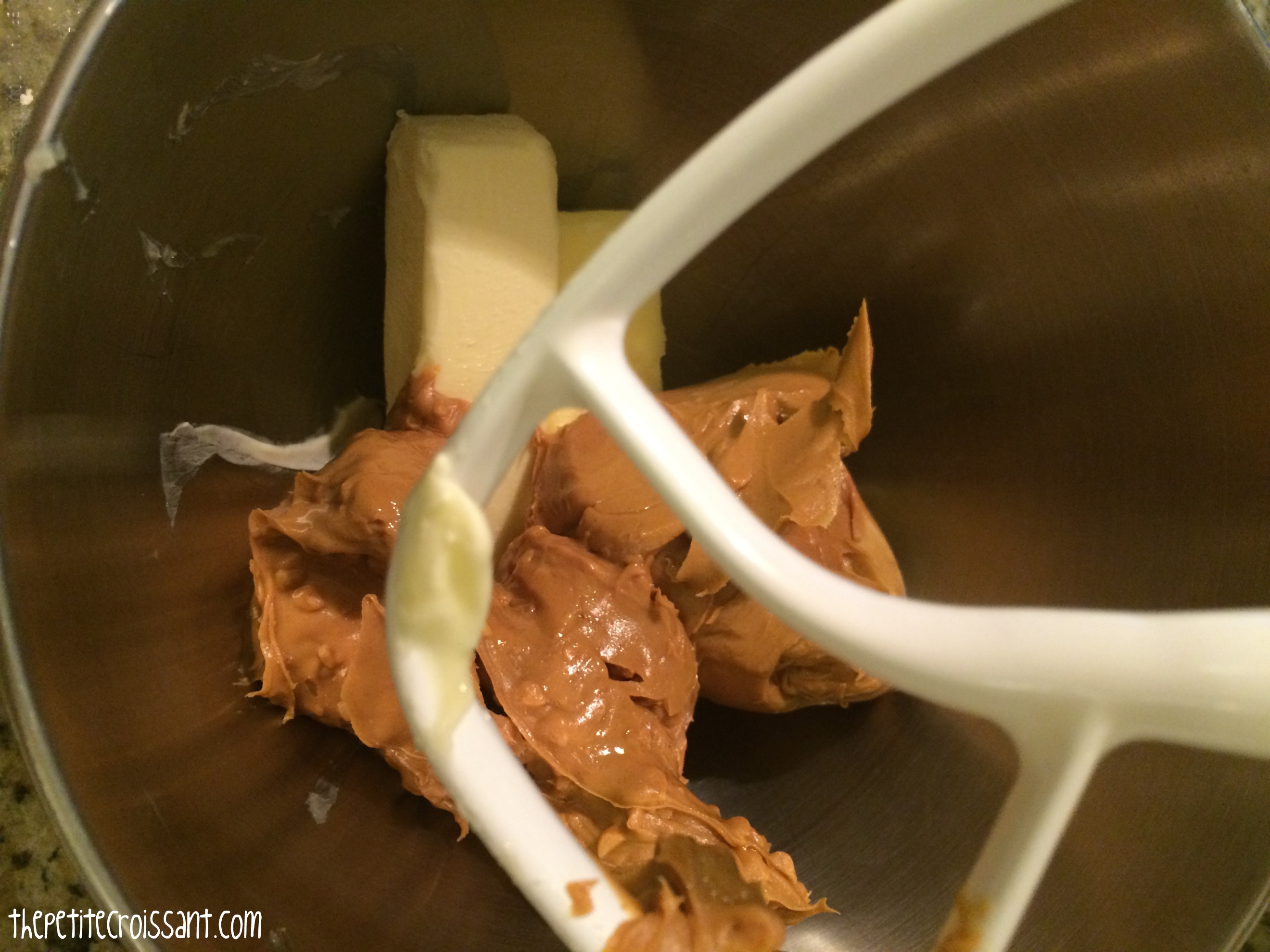 4. Now make the peanut butter filling by mixing the butter and both kinds of peanut butter in a mixer fitted with the paddle attachment until it is smooth. Add the powdered sugar and vanilla and mix again. Once smooth, spread it on top of the dough. Place the pan in the fridge while you do the next step.