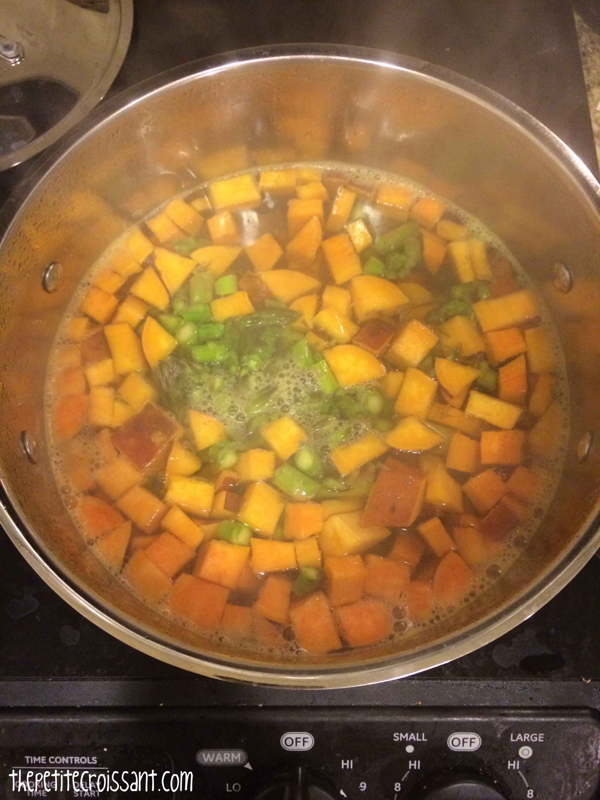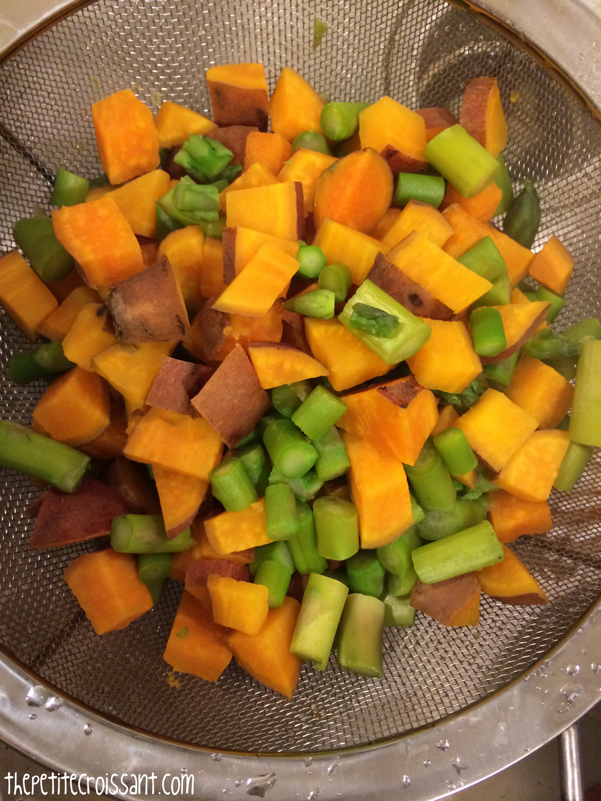 3. Once the water is boiling, place the potatoes in the water and cook them for 5-7 minutes. At 4 minutes, add the asparagus and cook for the remaining time with the potatoes. They are done when you can pierce the potatoes with a fork. Drain the veggies and set them aside.