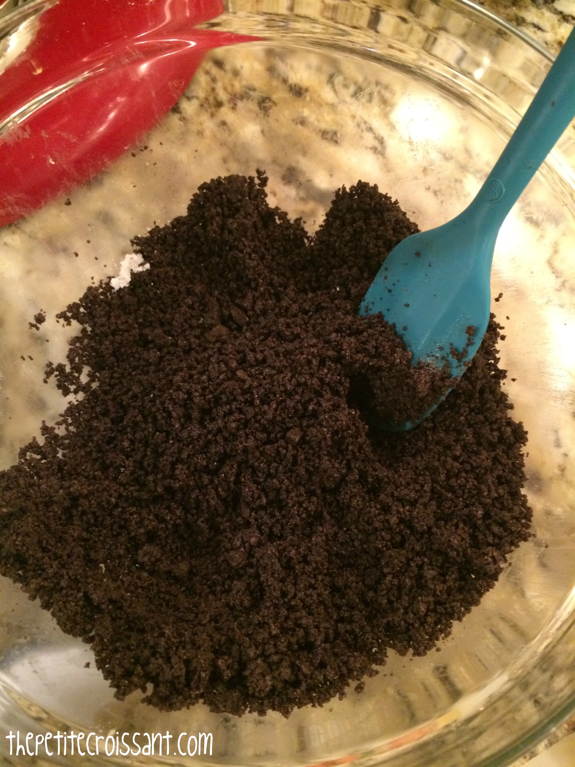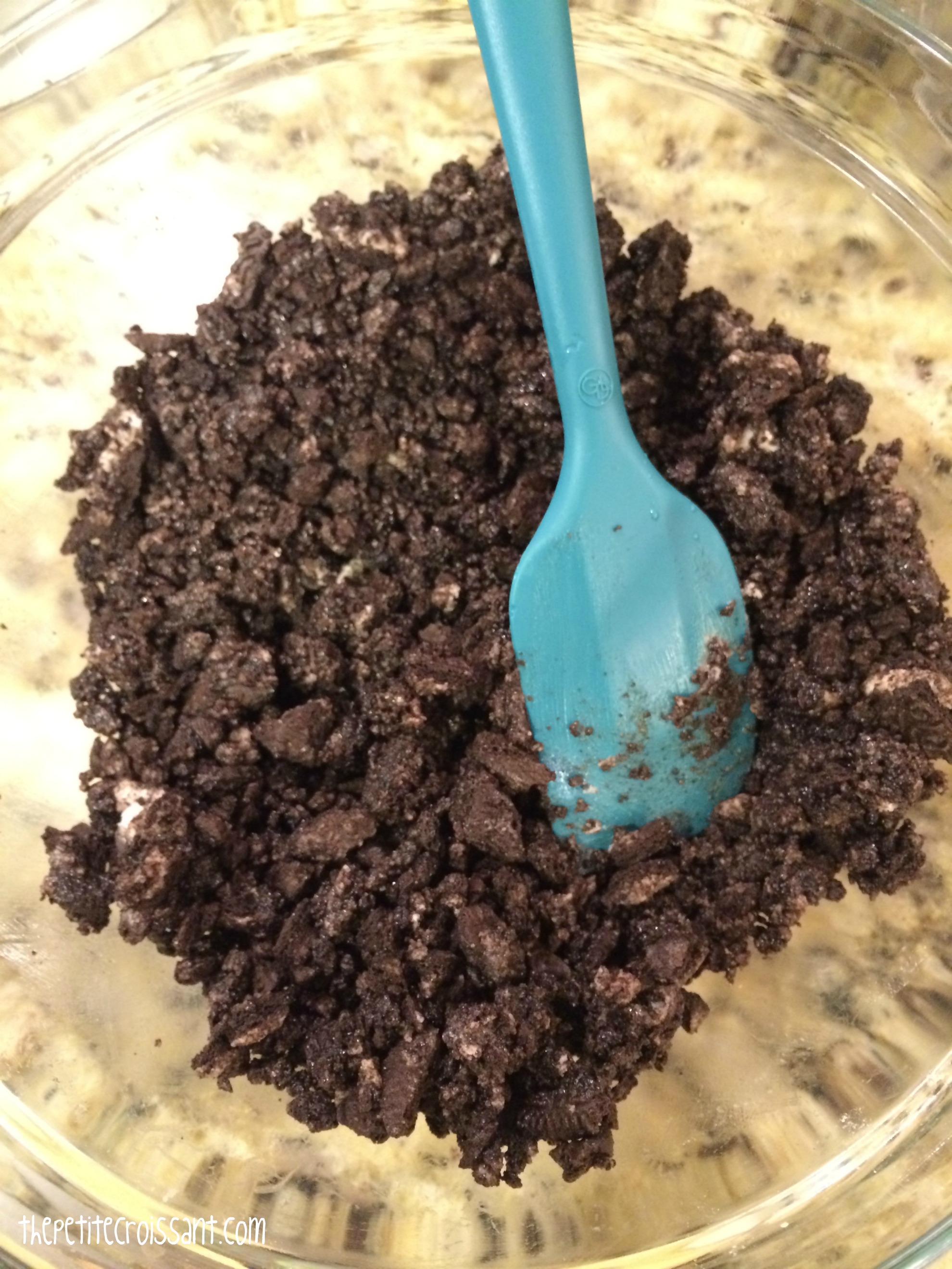 2. Place 10 Oreo cookies, with the frosting still inside, in a ziplock and smash them up. Place the crumbs in a bowl and add butter. Mix and then divide amongst the spots on the pan. Place the pan in the oven and cook for 5 minutes to get the crust to set.
