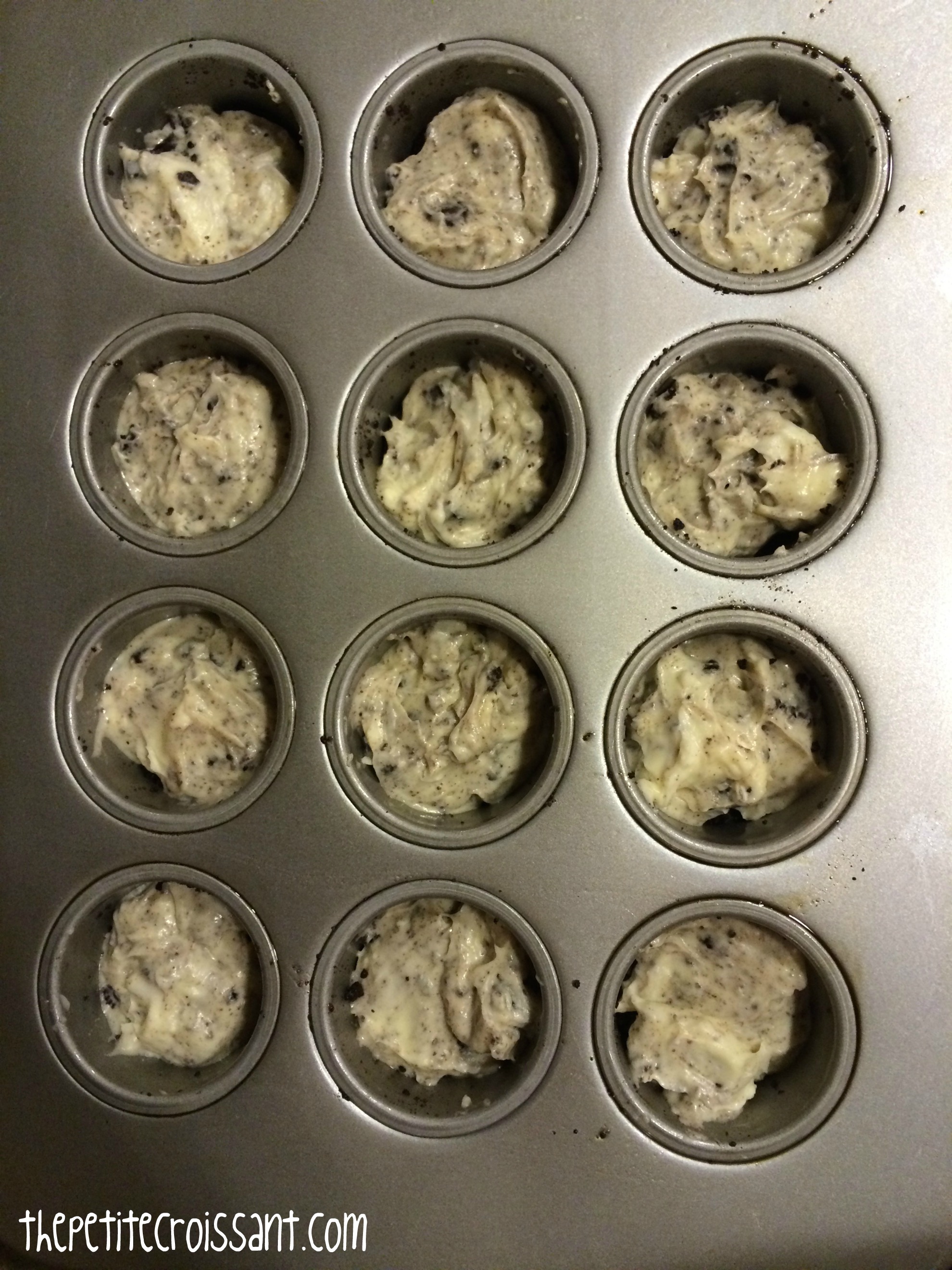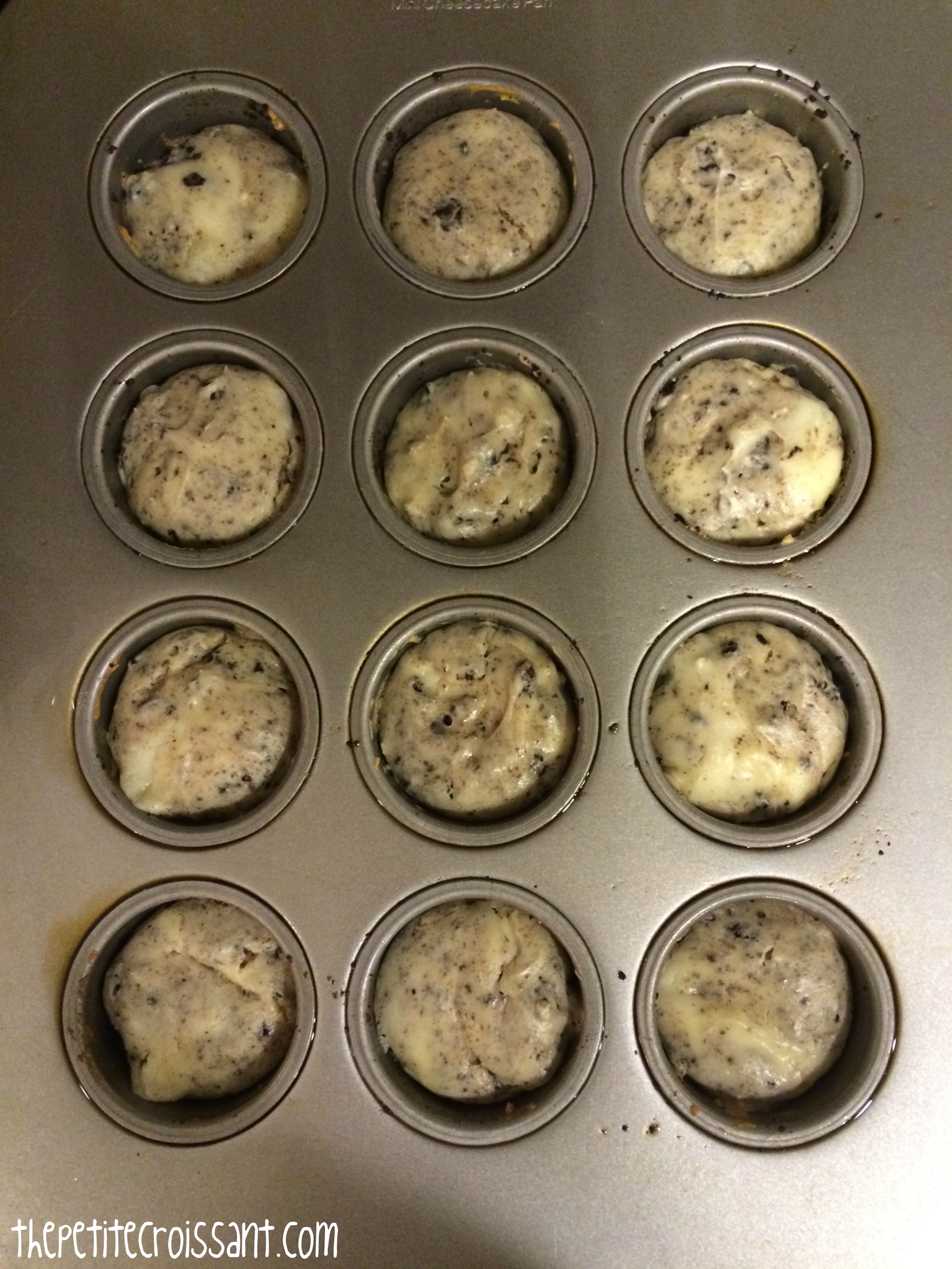 4. In the bowl of your stand mixer fitted with the paddle attachment, beat the cream cheese and sugar until smooth. Add the vanilla, cookie bits, and egg and continue mixing until fully incorporated. Fill each spot on the pan until they are all 3/4 full. Pick up the pan and lightly tap it on the counter to get rid of any air bubbles. Bake the cheesecakes for 14-17 minutes until the edges start to lightly brown. You will want to let them cool completely before you try to remove them from the pan.