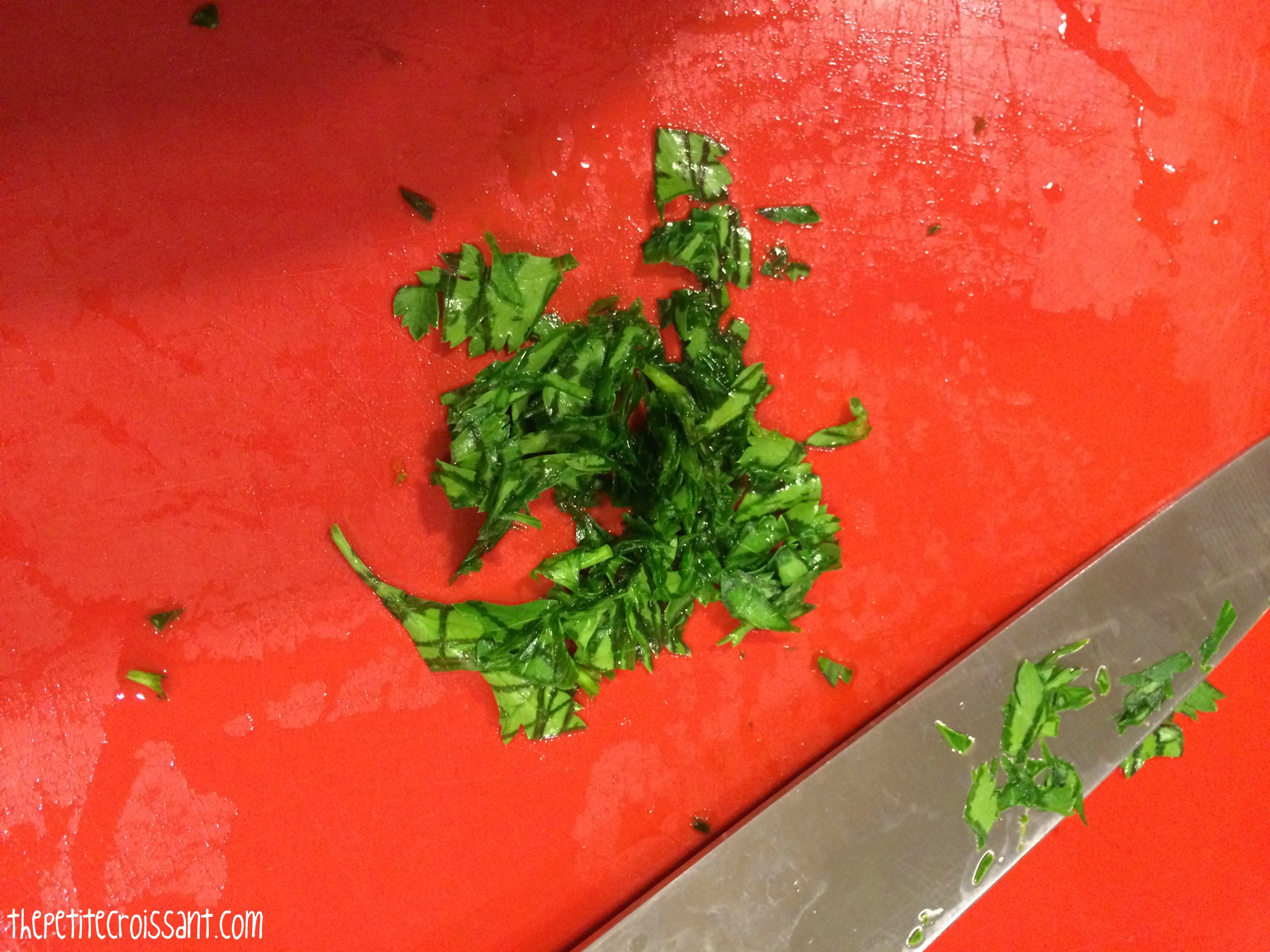 4. Make the dressing by mixing the ingredients with a whisk. Drizzle the dressing over the rest and then serve immediately topped with chopped parsley.