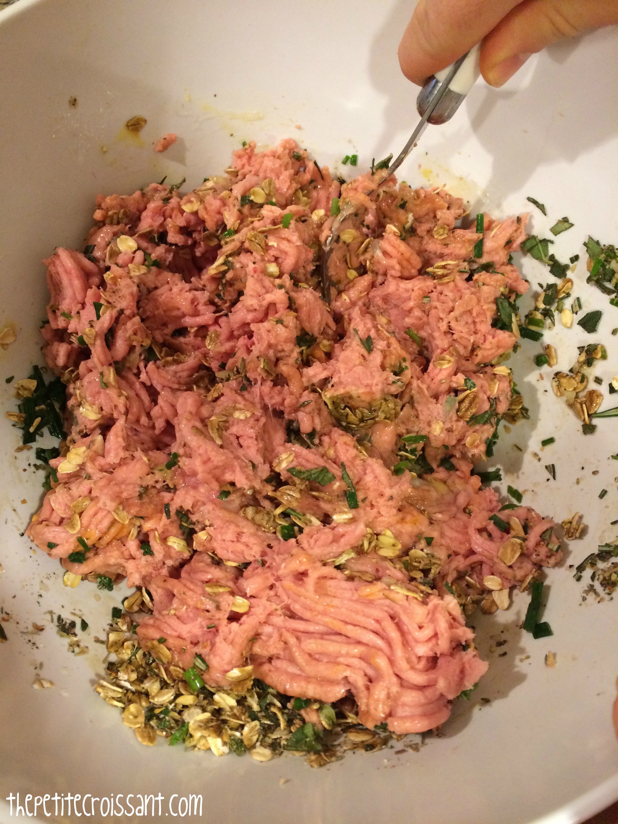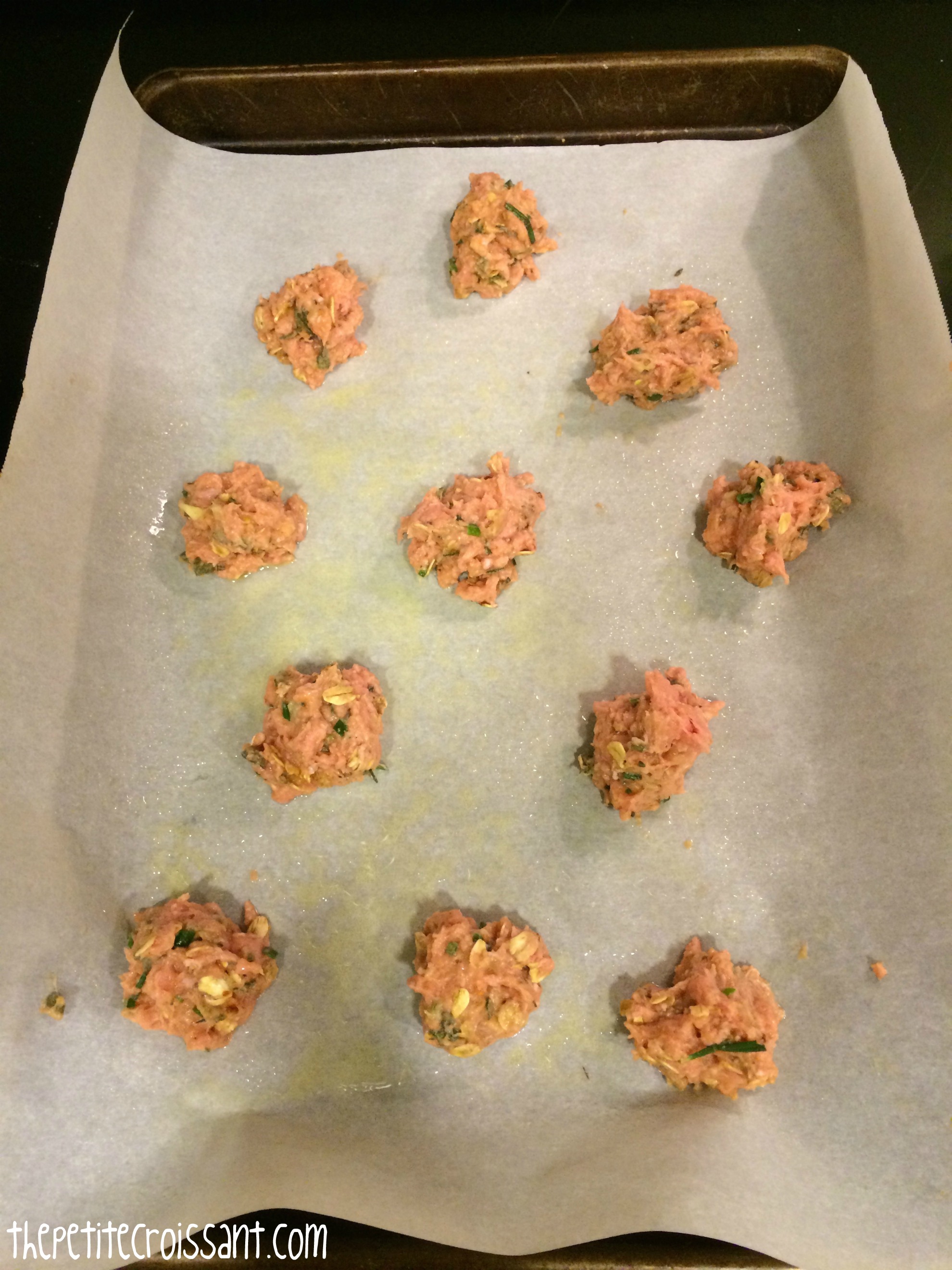 1. Preheat the oven to 375 degrees. Place all the meatball ingredients in a bowl and use your hands to mix. Divide the batter up into small mounds, about 2 tablespoons each, and place on a pan covered in foil, wax paper, or silicone liners.