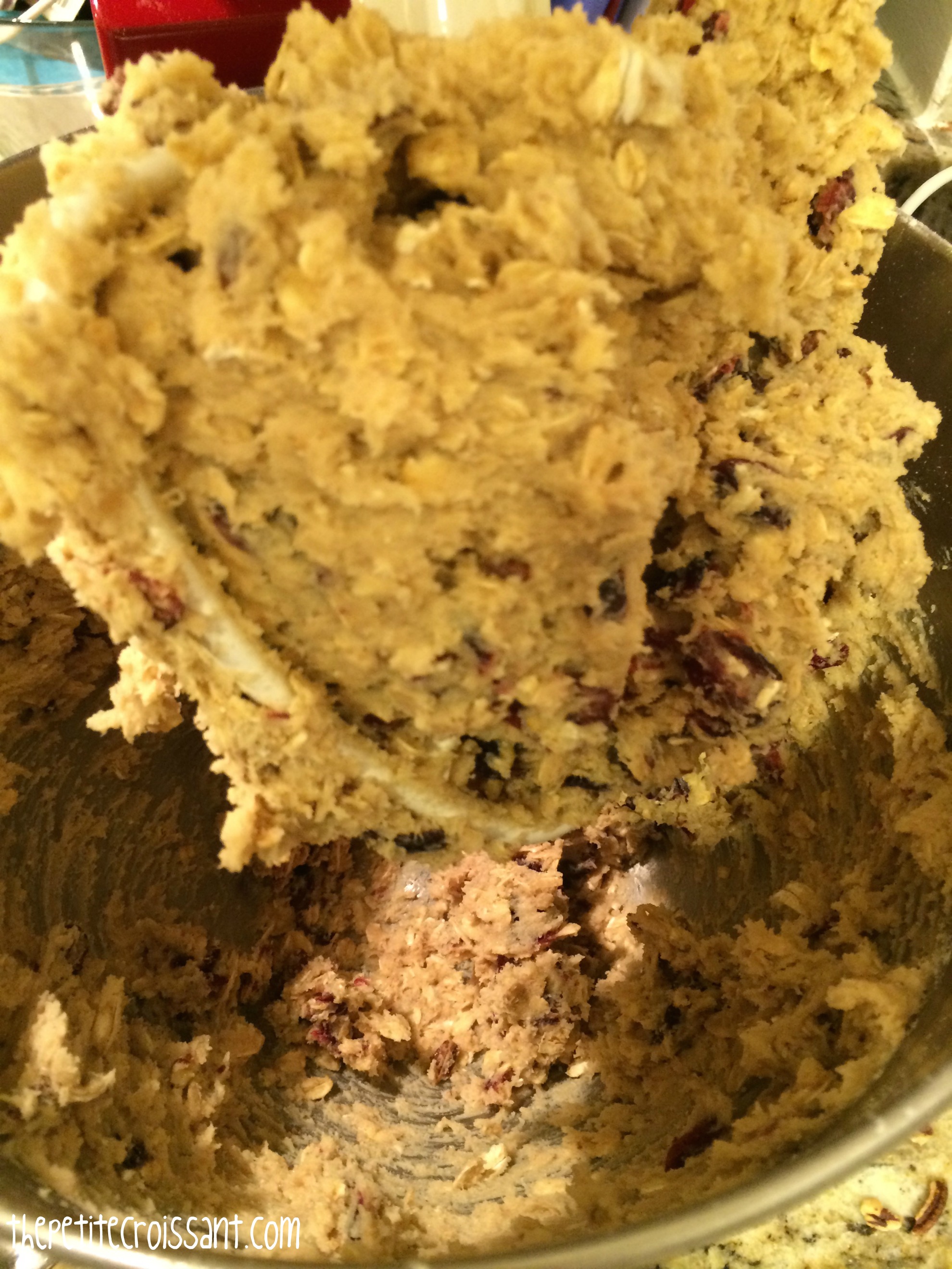4. Add the oats and mix slowly until they are all incorporated. Manually mix in the cranberries and pecan pieces.